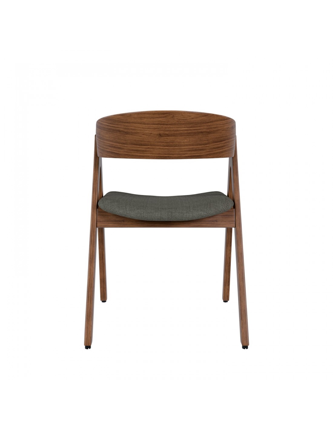 Cadeira de madeira folheada, em nogueira com design de estilo nórdico. Assento estofado em tecido tipo chenille com uma mistura de poliéster e algodão, de fácil limpeza, não amovível, cores bege, cinza e marrom. A estrutura de madeira terminada em nogueira e a cor de seu estofado combinam de forma perfeita para oferecer uma peça singular e elegante para qualquer estadia. Sua originalidade há que se encaixe em todos os tipos de estilos, desde os mais clássicos aos mais modernos.