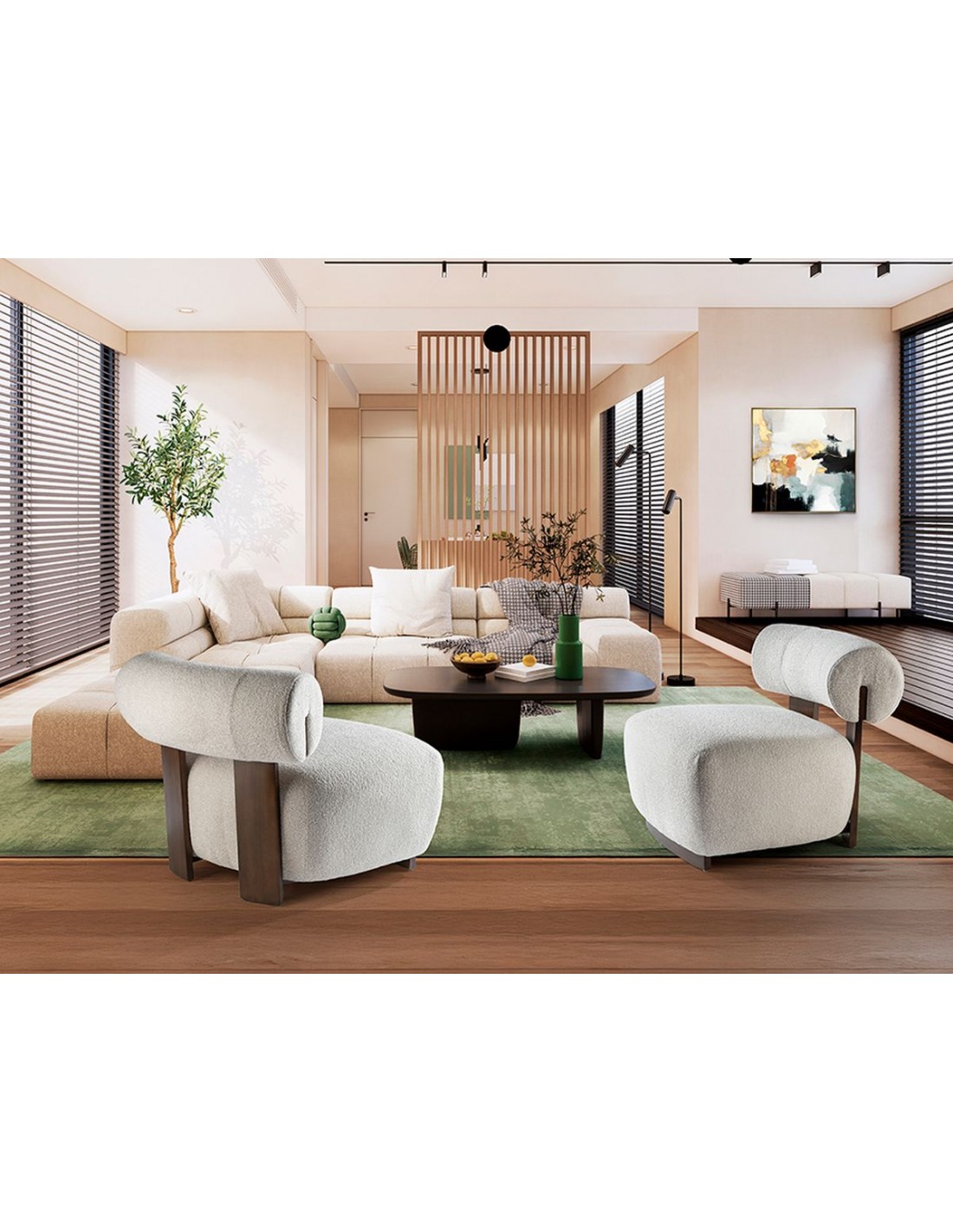 O design do cadeirão NAOMI reflete os princípios do mobiliário moderno: linhas limpas, proporções equilibradas e materiais honestos. A estrutura em madeira com acabamento preto cria um contraste elegante com o estofado, conferindo personalidade sem excessos.