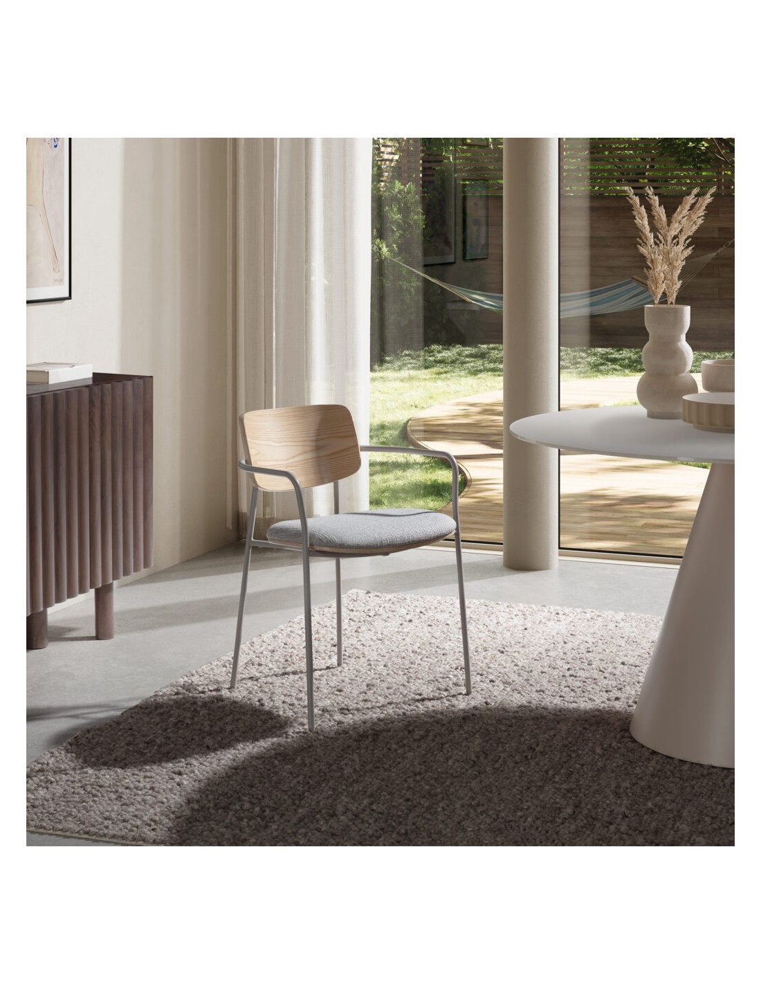 Se procura uma peça que una estética contemporânea, conforto diário e materiais nobres, a Cadeira de design NOUR com Encosto em carvalho, assento estofado em bege e pés em metal cinza é a escolha ideal. A combinação de madeira natural, tecido neutro e estrutura metálica cria um equilíbrio perfeito entre calor visual e leveza estrutural.