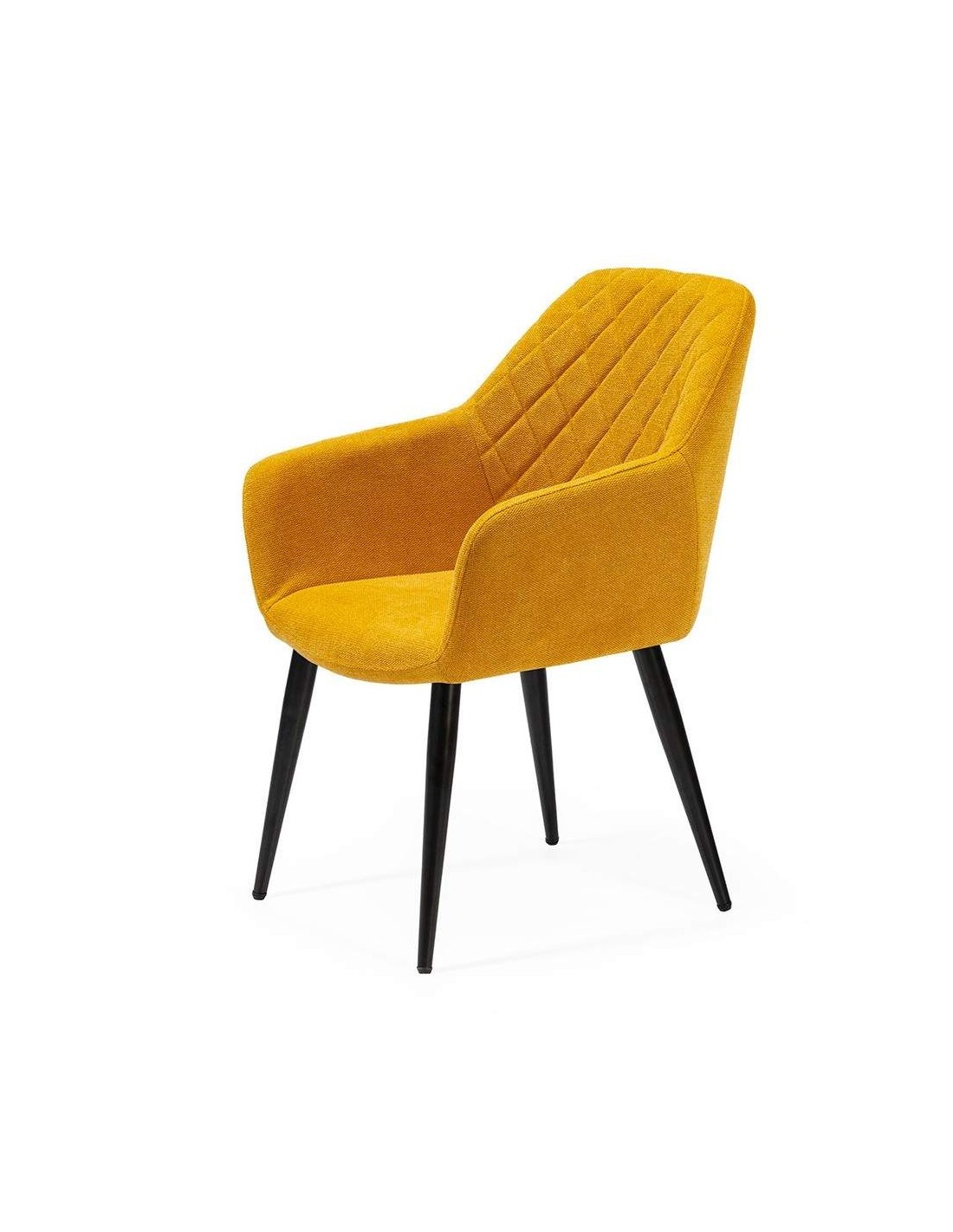 Cadeira de jantar NINA com braços, tecido e pernas de metal preto.