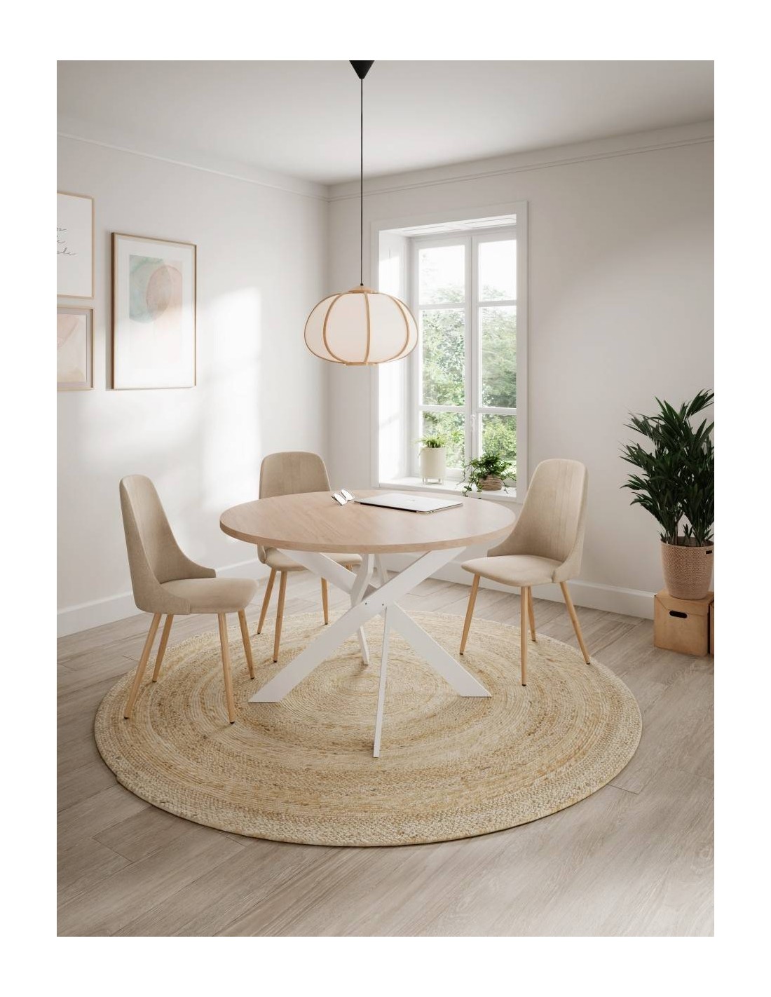 A cadeira de jantar SEOUL é uma peça elegante e versátil que acrescenta um toque de classe à sua sala de jantar. O seu design intemporal e os estofos em tecido bege tornam-no adequado para uma variedade de estilos de decoração. O que realmente se destaca nesta cadeira são as pernas de metal, habilmente revestidas de papel para simular a aparência quente e natural da madeira.