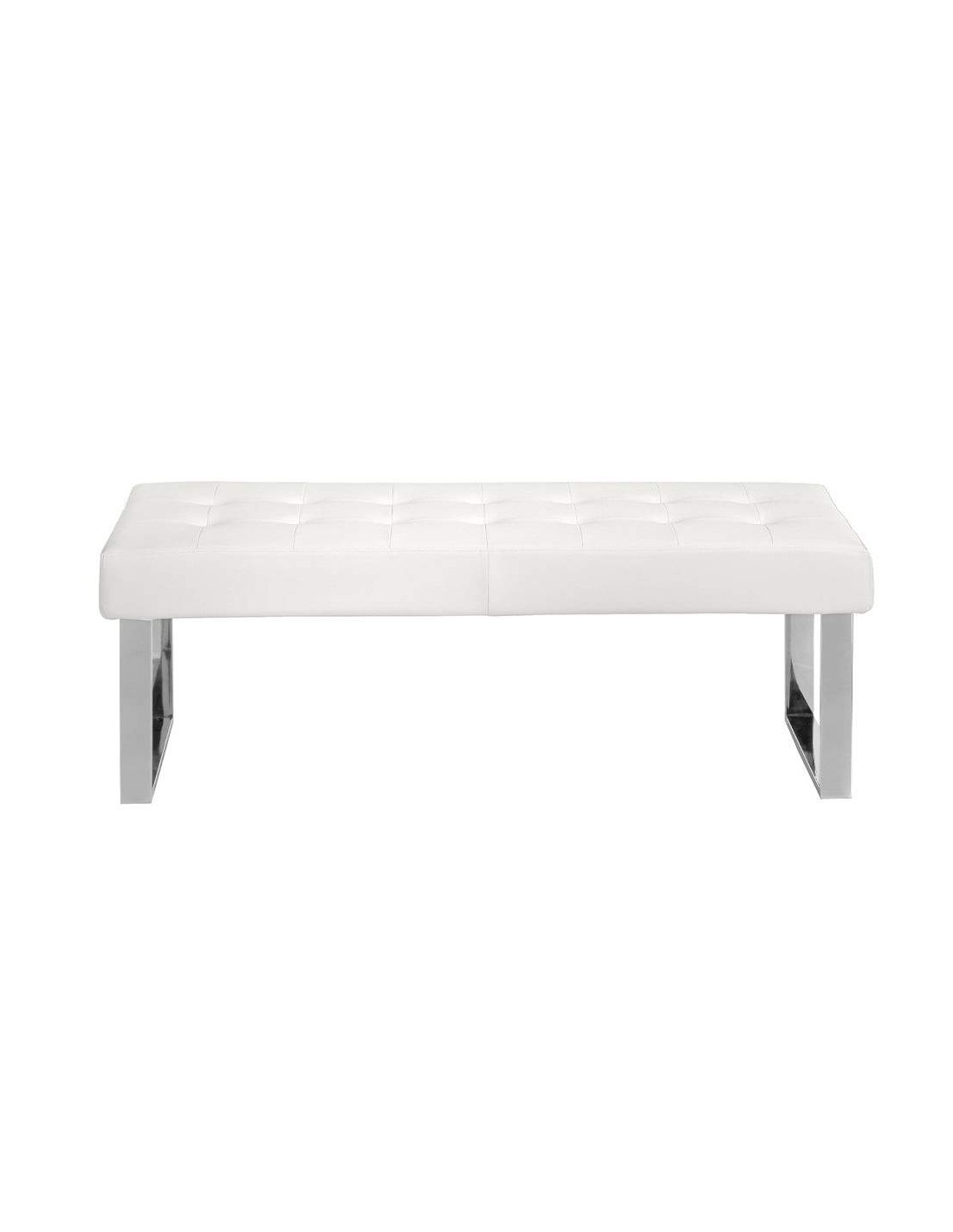 Banqueta descalzadora de design italiano estofada em couro sintético branco, com assento capitoné recheado em espuma de poliuretano de 25kg / m3. A sua robusta estrutura interna de chapa DM de 2cm de madeira de pinho, assim como a sua original estrutura de pernas de aço inoxidável cromado de 22 mícrons trará aquele toque de vanguarda e elegância que procura para o seu quarto. Uma banqueta auxiliar perfeita para colocar aos pés da cama, e criar um ambiente caloroso e descontraído na sua estadia.