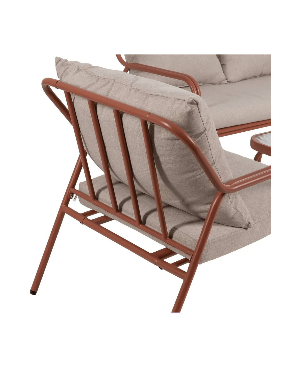 Aproveite o sol, a brisa e o relaxamento com o estilo único do conjunto PUIG. Com estrutura em aço com acabamento em terracota, este conjunto destaca-se pela sua estética moderna e pela sua resistência. As almofadas bege proporcionam conforto e aconchego, criando um equilíbrio perfeito entre funcionalidade e elegância. A mesa de centro com tampo de vidro complementa o conjunto com um toque prático e sofisticado. Se procura um conjunto outdoor com personalidade, cor e conforto, o conjunto PUIG é a escolha perfeita para criar o seu recanto exterior preferido.