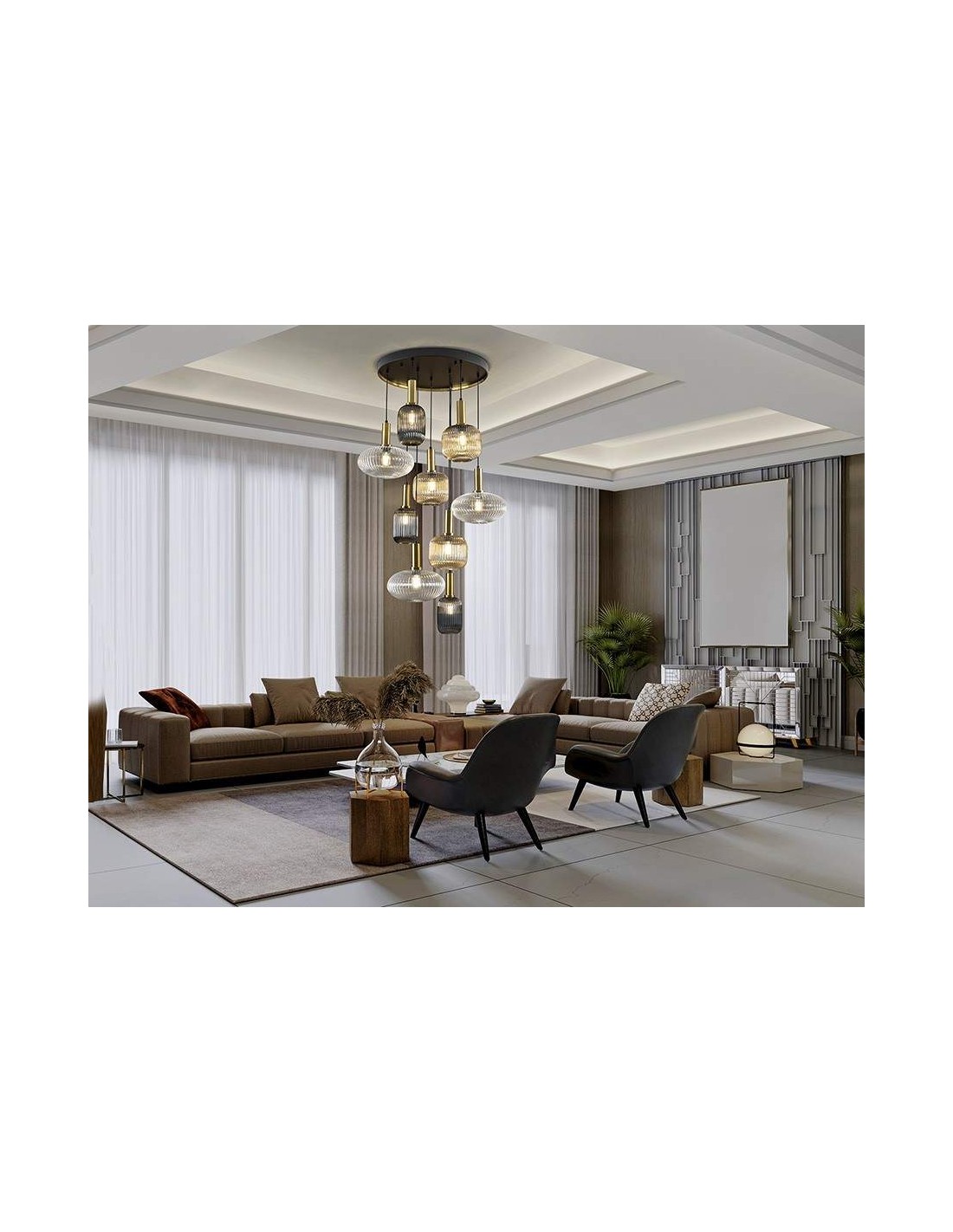 Candeeiro de 9 focos em metal com acabamento em preto mate, com detalhes em latão acetinado. Tons de vidro moldado em acabamento transparente, âmbar e cinza fumê espelhado. Altura ajustável.