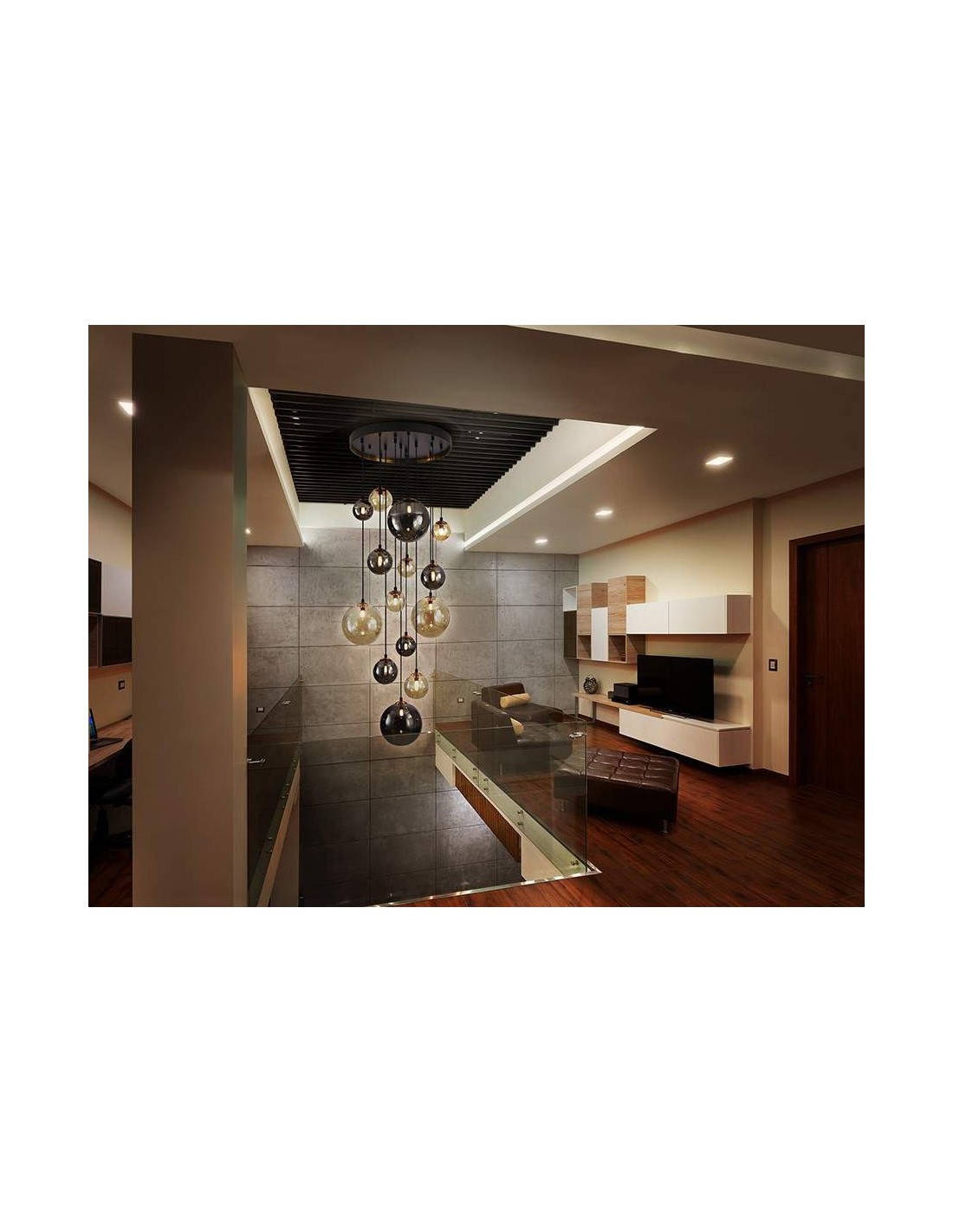 Candeeiro de 14 focos em metal com acabamento em preto mate, com detalhes em latão acetinado. Abajures de vidro esférico de 10,12 e 20 cm, nos acabamentos âmbar e cinza fumê espelhado. Altura ajustável. Inclui 14 LEDs G9 4W