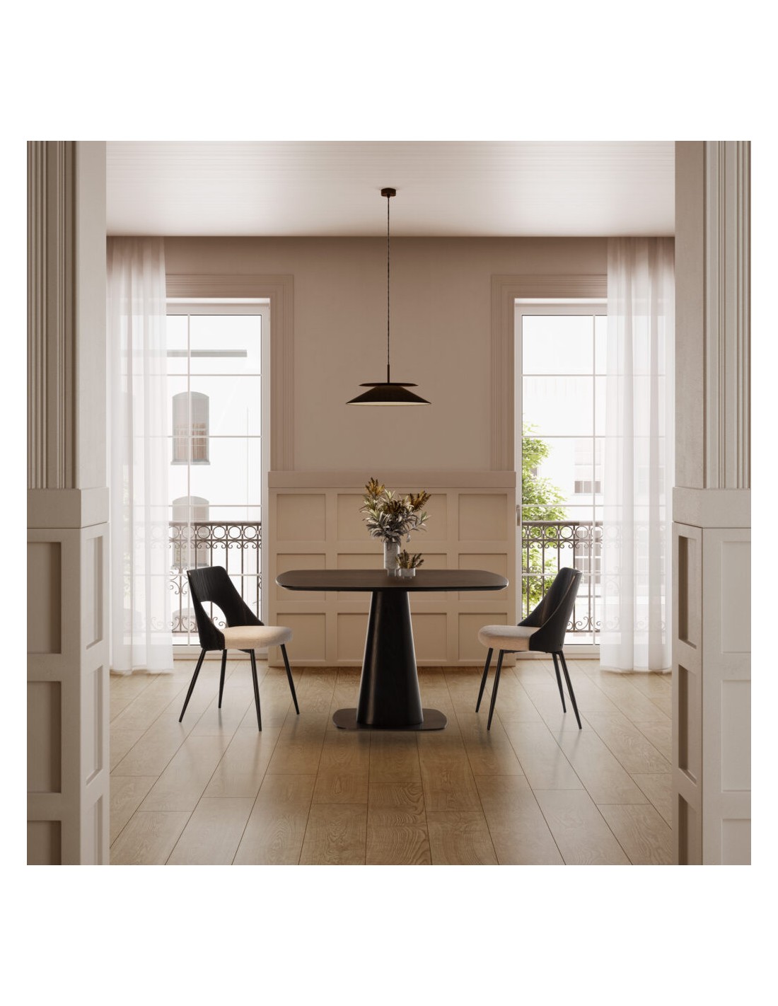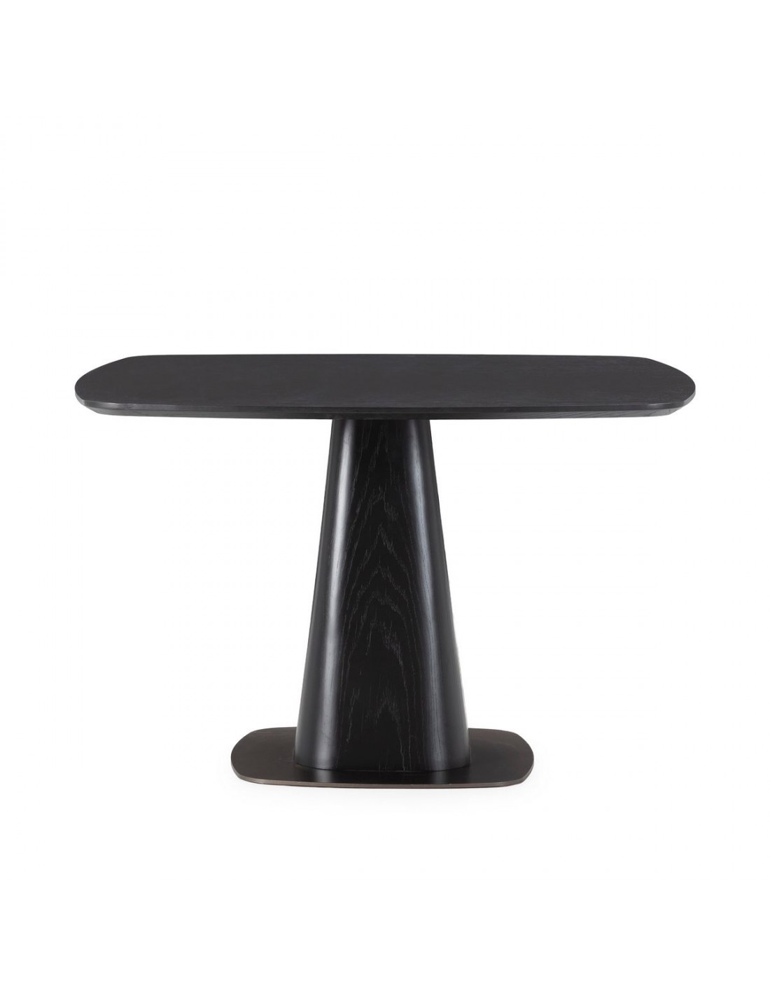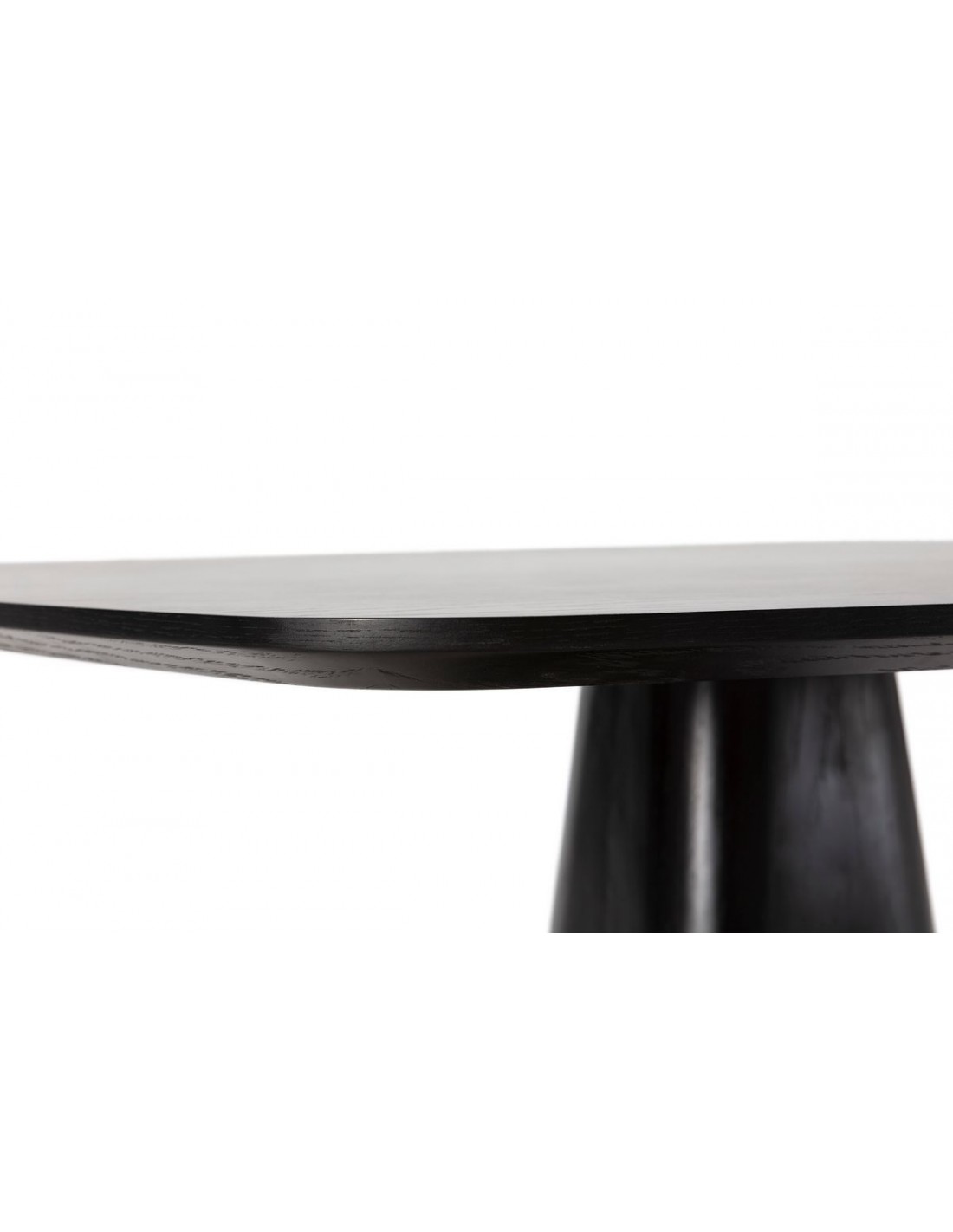 O acabamento preto sobre folha natural de carvalho realça subtilmente o veio da madeira, criando profundidade visual e um efeito sofisticado. A base central robusta proporciona excelente estabilidade e maior conforto, permitindo melhor aproveitamento do espaço para as pernas.