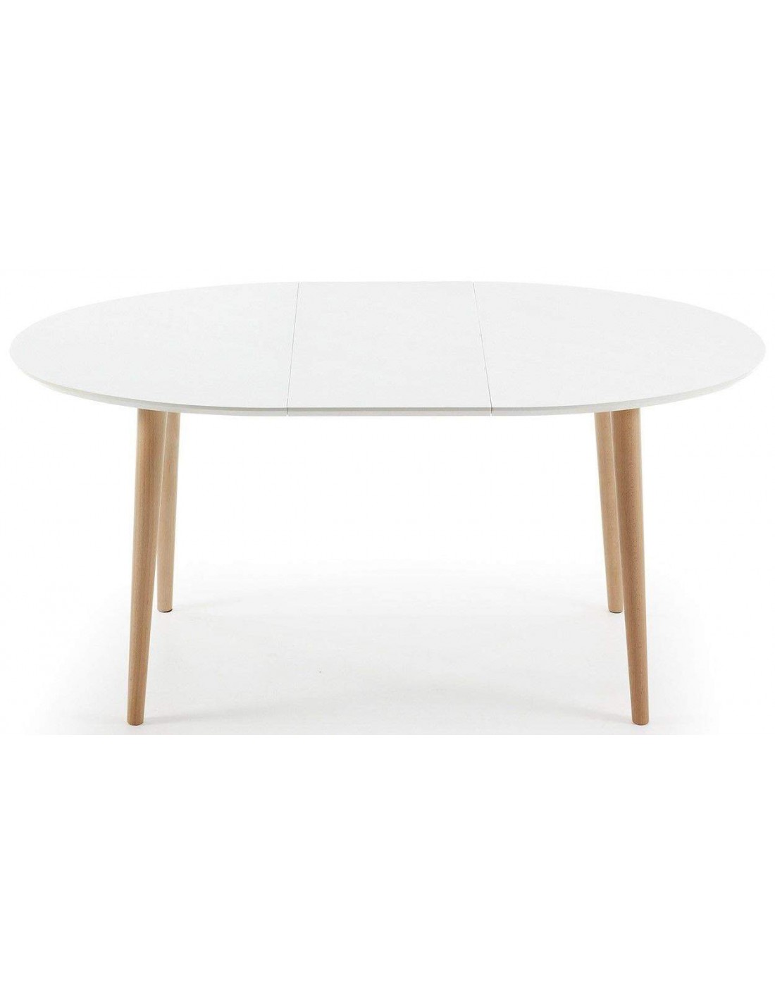 Mesa extensível oval com envelope DM lacado na cor branca mate. Pés de forma conica em madeira de faia natural envernizada de 6-3 cm. de diâmetro. Comprimento máximo 200 cm. pode dispor desta polivalente mesa em três medidas diferentes (120-160-200cm) mediante 2 partes extensíveis extras de 40 cm cada uma.