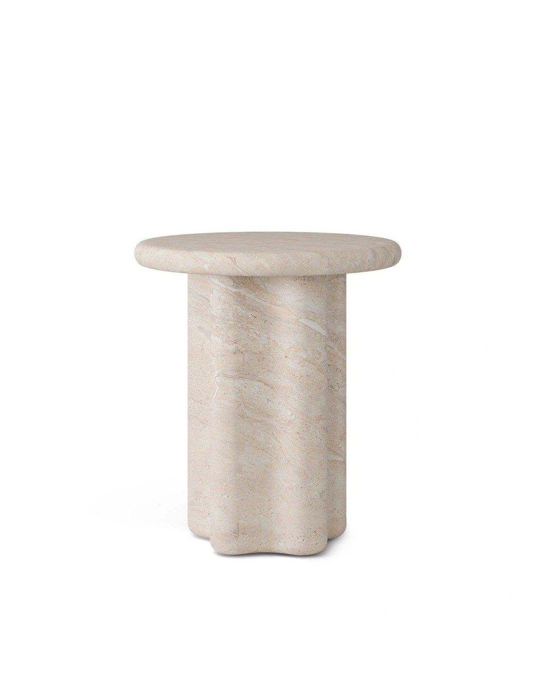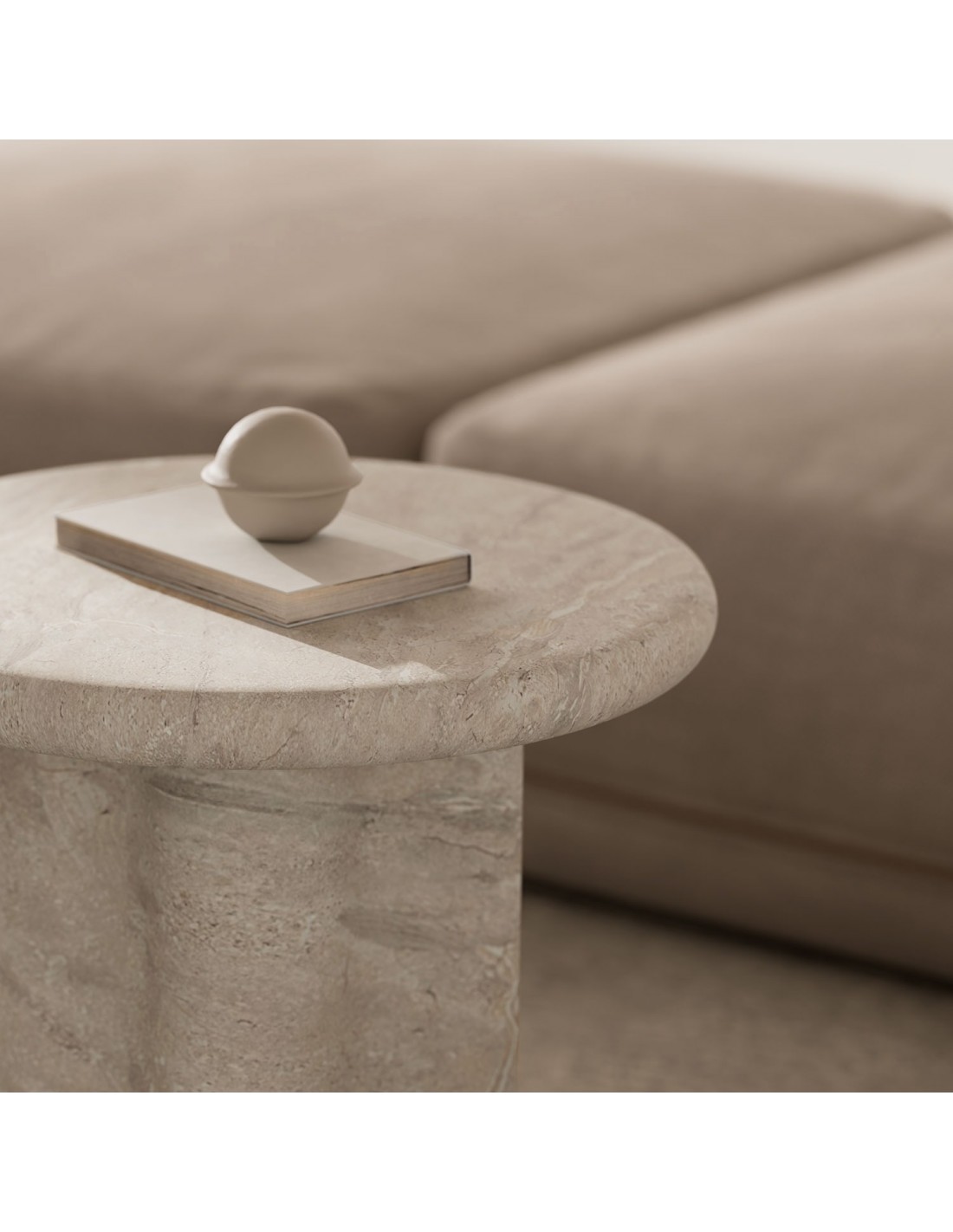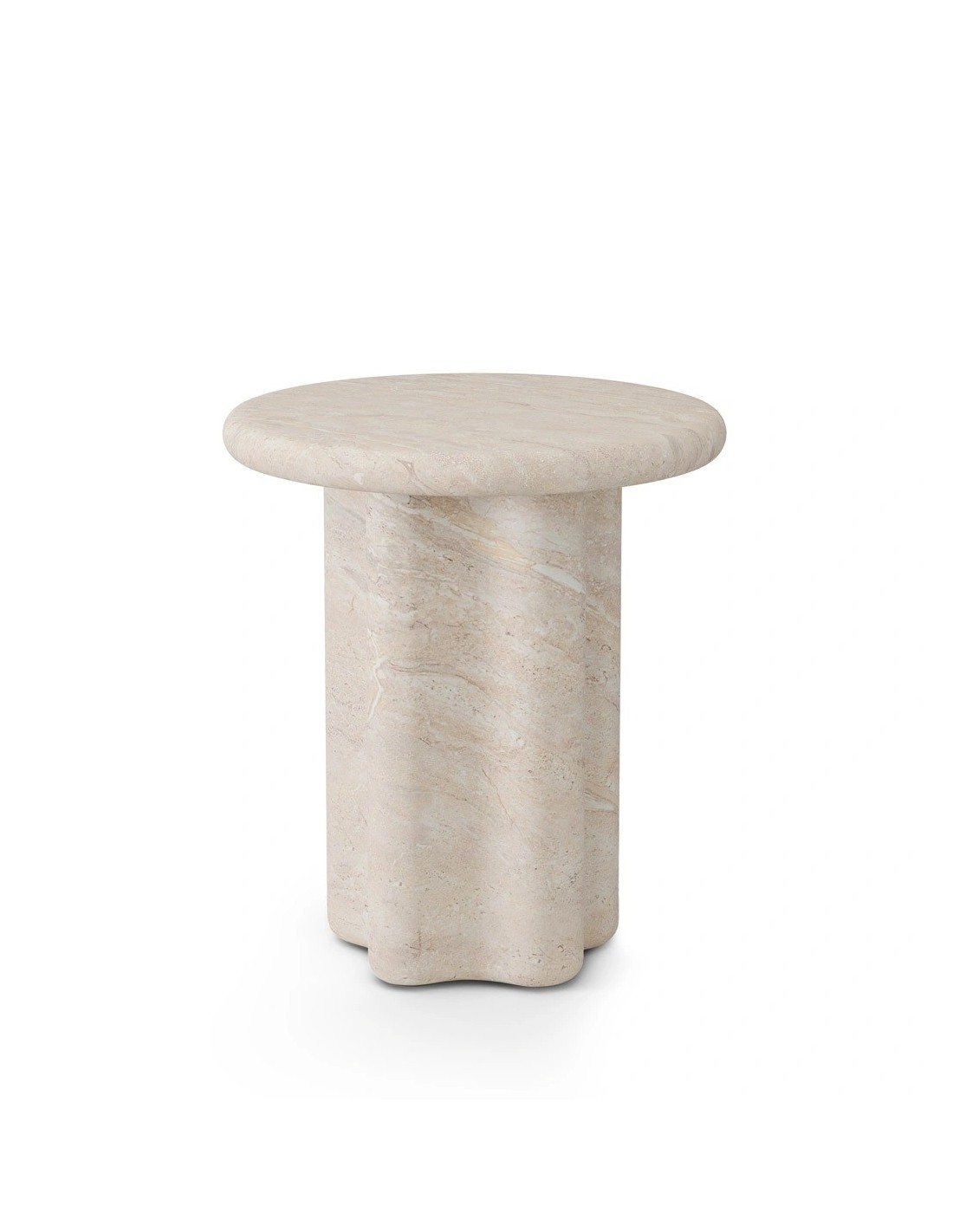 A mesa auxiliar EMERIC é uma peça compacta e versátil: feita em microcimento, oferece resistência e continuidade visual, enquanto o seu acabamento em travertino transmite veios quentes que evocam a pedra natural. Com ø50 cm de diâmetro e 55 cm de altura, a sua base ondulada confere-lhe um carácter escultural sem perder a praticidade.