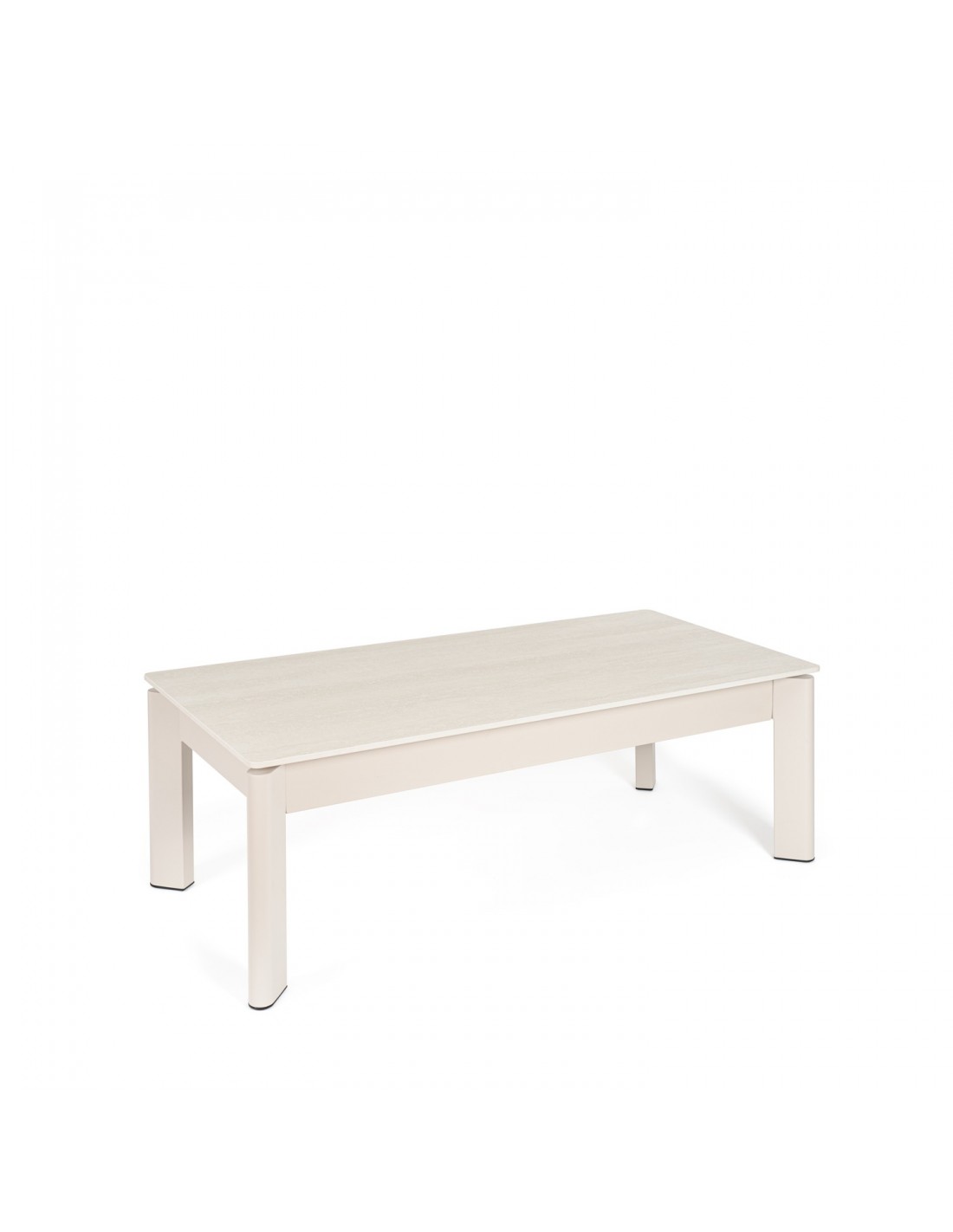 O tampo porcelânico de 12 mm de espessura reproduz com realismo o aspeto da pedra travertino, conferindo um toque acolhedor e atemporal, inspirado nos interiores mediterrânicos e no classicismo italiano. A estrutura metálica em tom bege complementa o conjunto, criando um ambiente equilibrado e natural.