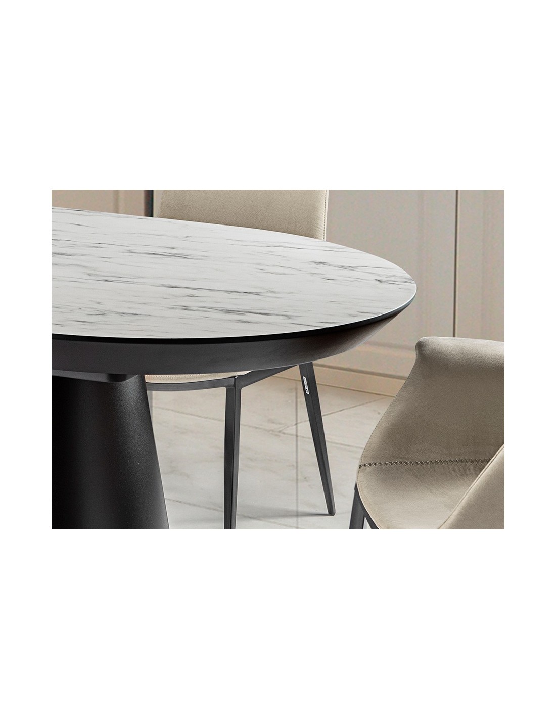 Mesa CAPRI: Mármore branco brilho e estrutura preta fosca para elegância e funcionalidade