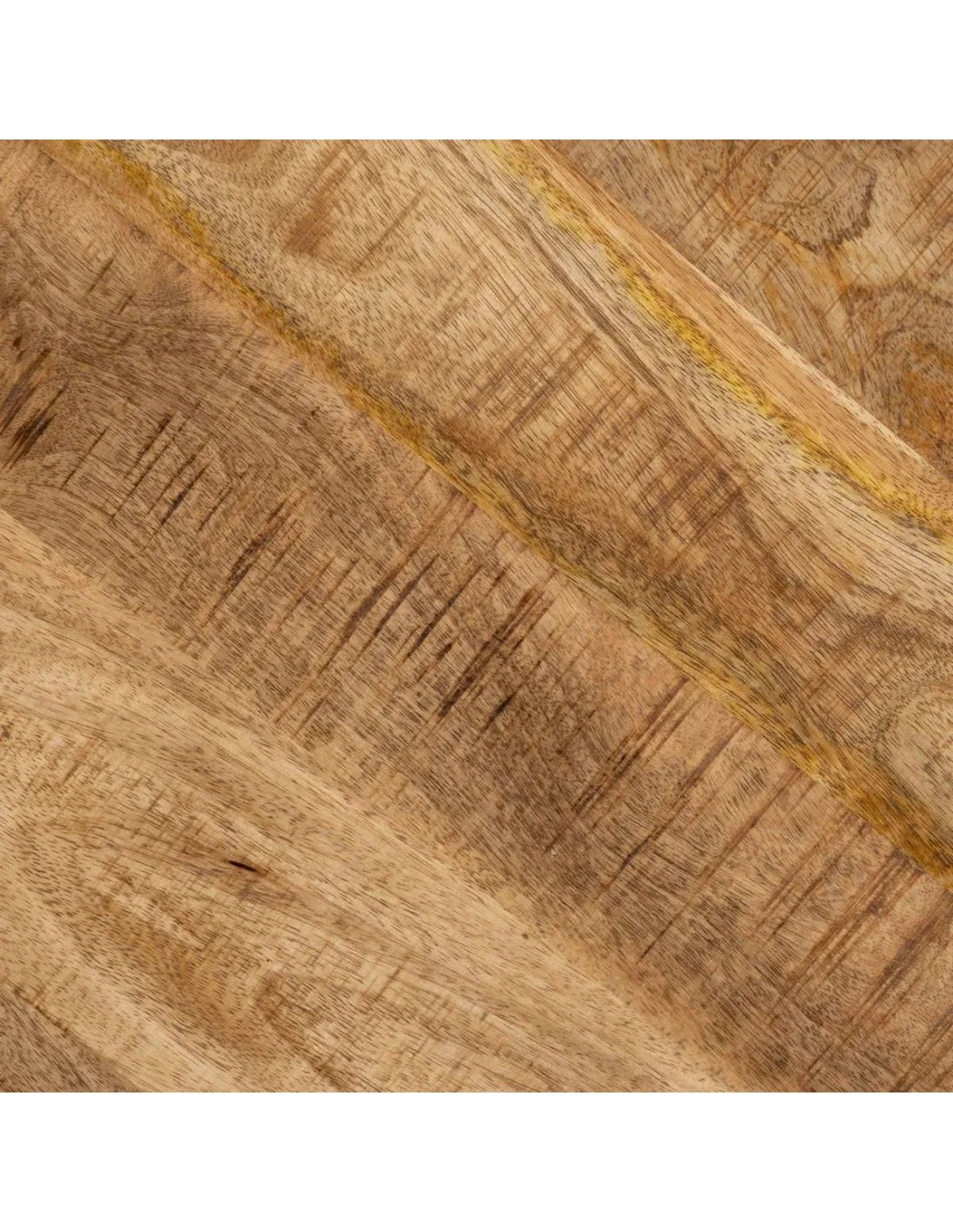 A madeira de manga é durável, visualmente rica e mais sustentável que outras opções sintéticas. As pernas em ferro preto adicionam estabilidade e modernidade ao conjunto.