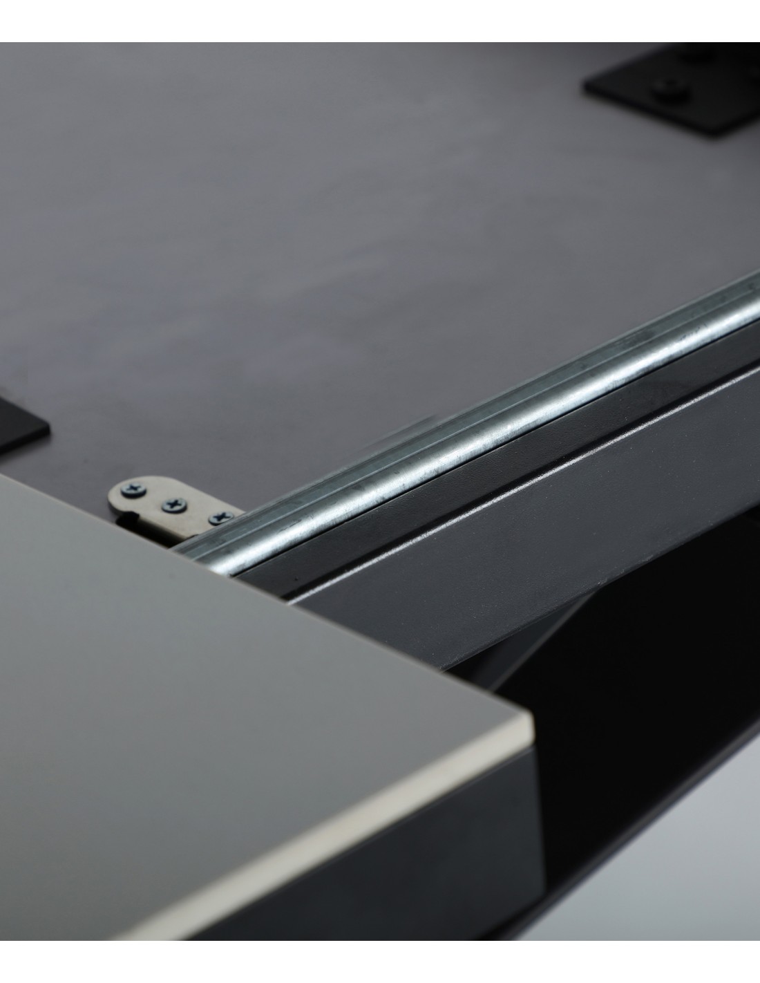 - Tampo: 4 cm de espessura, em DM preto + cerâmica branca mate com veios cinza