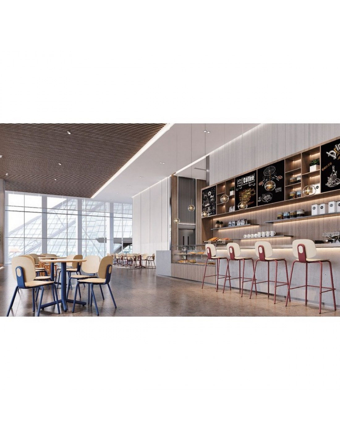 A Mesa Retro Schooly de 70 x 70 cm recupera a estética das mesas escolares clássicas dos anos 60 e 70, reinventada para cozinhas, cafés e espaços profissionais contemporâneos. Com estrutura central tubular azul e tampo quadrado em contraplacado revestido a HPL natural, oferece durabilidade, praticidade e um estilo retro autêntico.