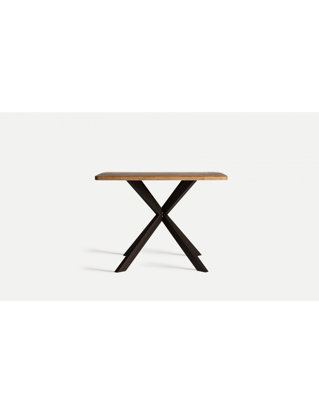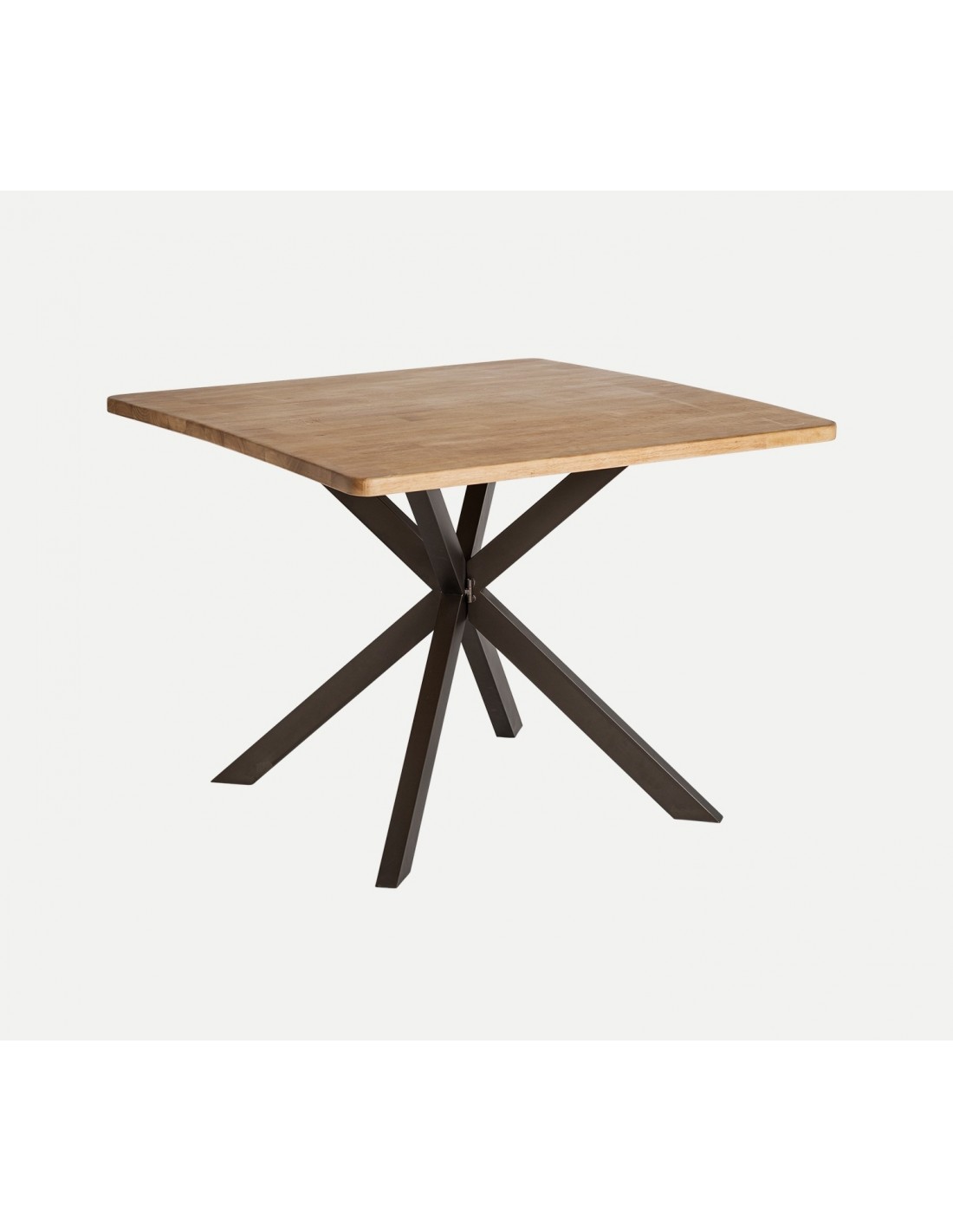 A mesa de jantar FERRONA 100 cm une a madeira de borracha em cor castanha com a força do metal preto. O seu design com pés cruzados proporciona estabilidade e um toque urbano, perfeito para quem deseja um ambiente contemporâneo e cheio de personalidade.