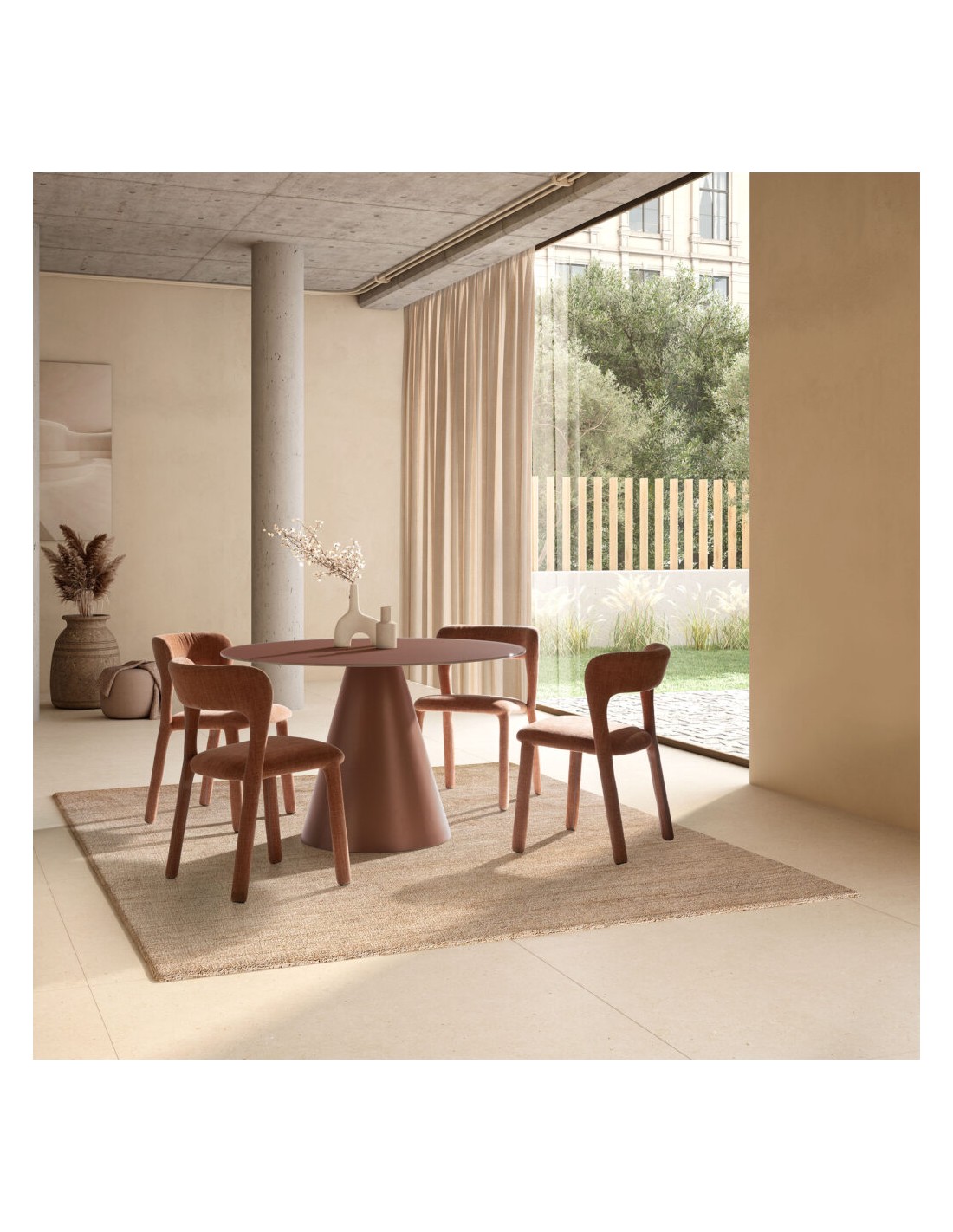 A Mesa de Jantar Redonda VIDA 120 cm em terracota com Tampo de Vidro e Base Metálica é a escolha perfeita para quem deseja uma sala moderna, luminosa e funcional sem abdicar do design.