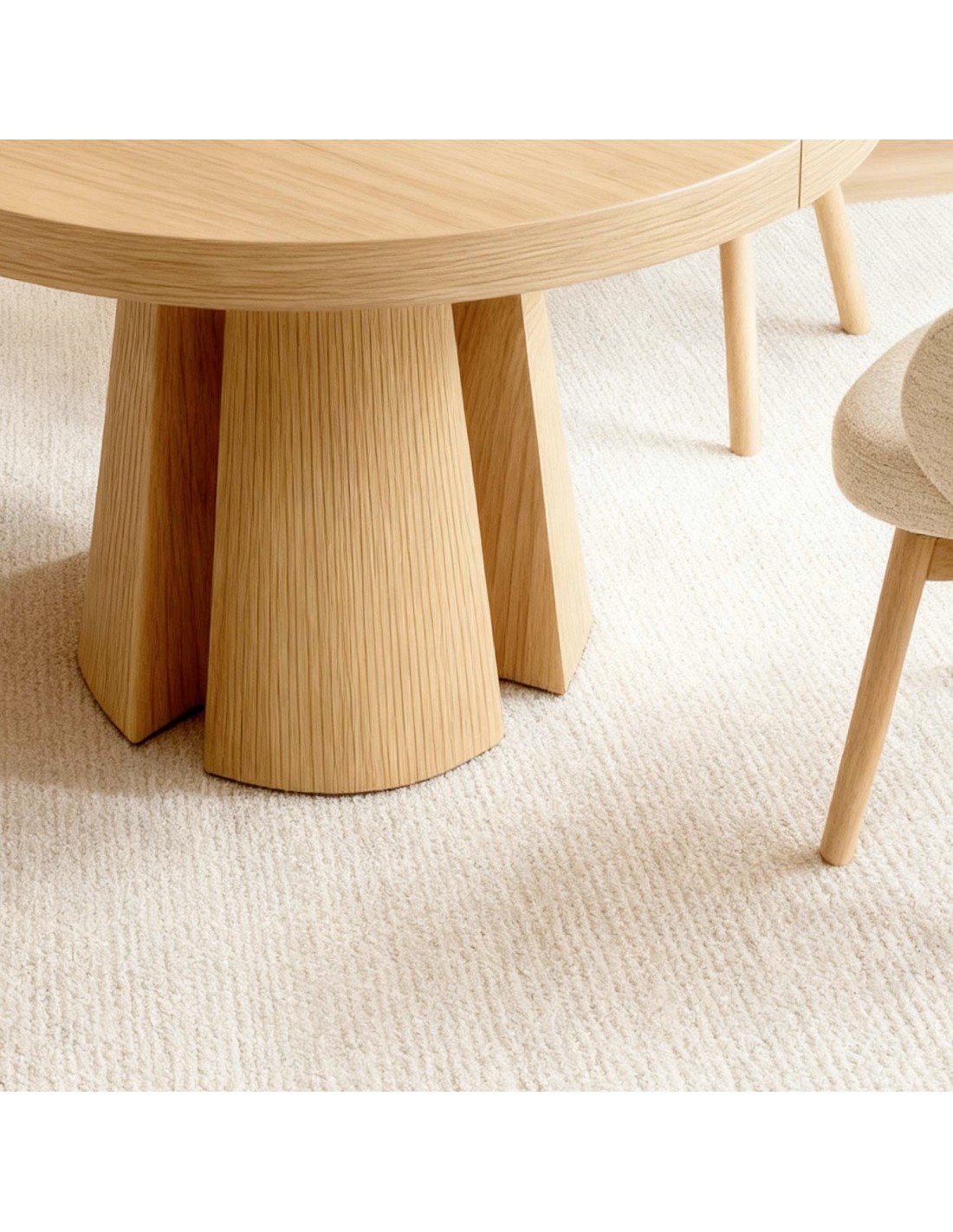 A mesa MARCELLA é uma joia do design contemporâneo que combina aconchego, funcionalidade e um perfil surpreendente. Produzida com folha de carvalho natural, sua superfície redonda de 120 cm — extensível até 170 cm — desdobra‑se a partir do centro com fluidez para se adaptar a jantares íntimos ou reuniões maiores, transformando‑se numa peça tão versátil quanto elegante.