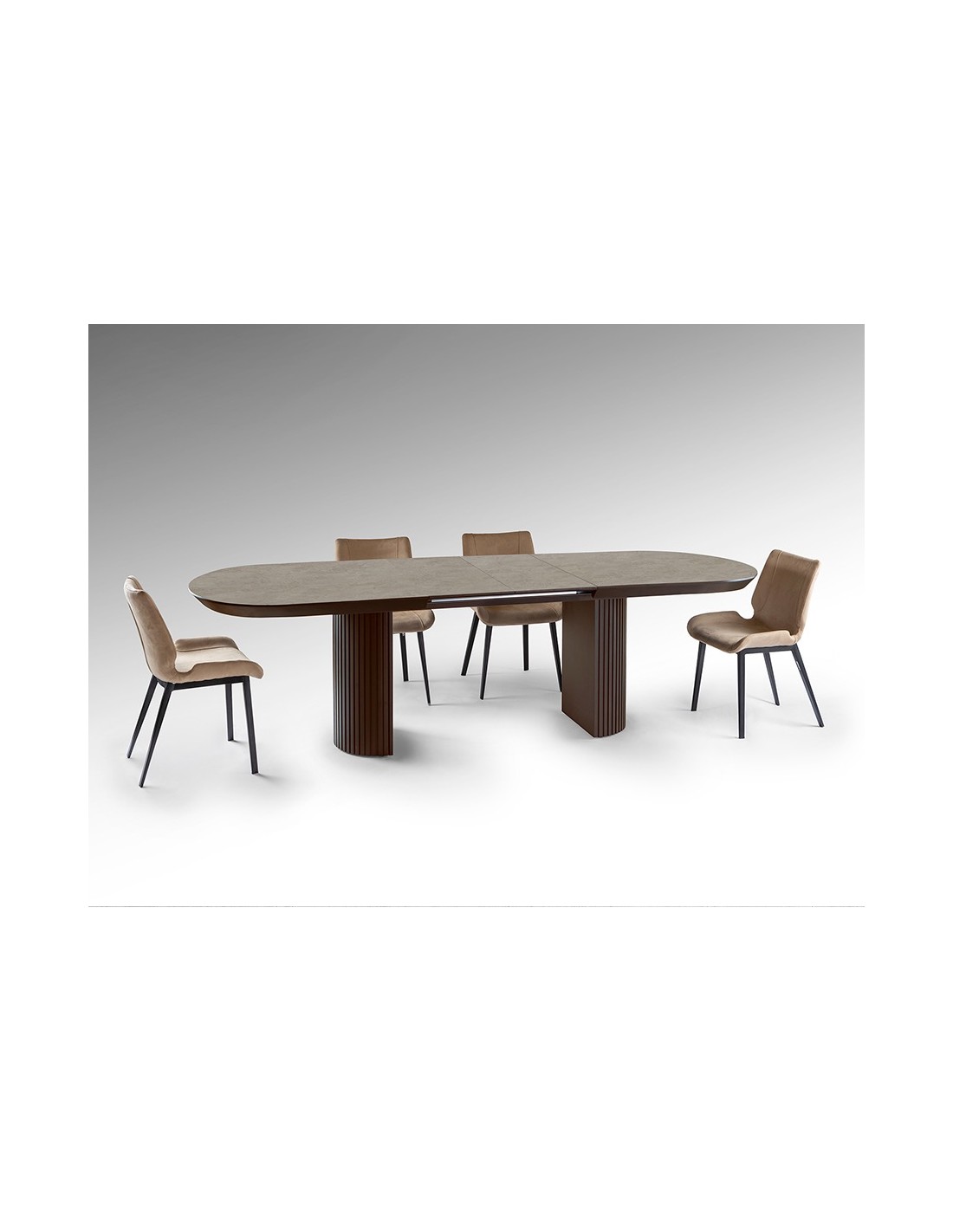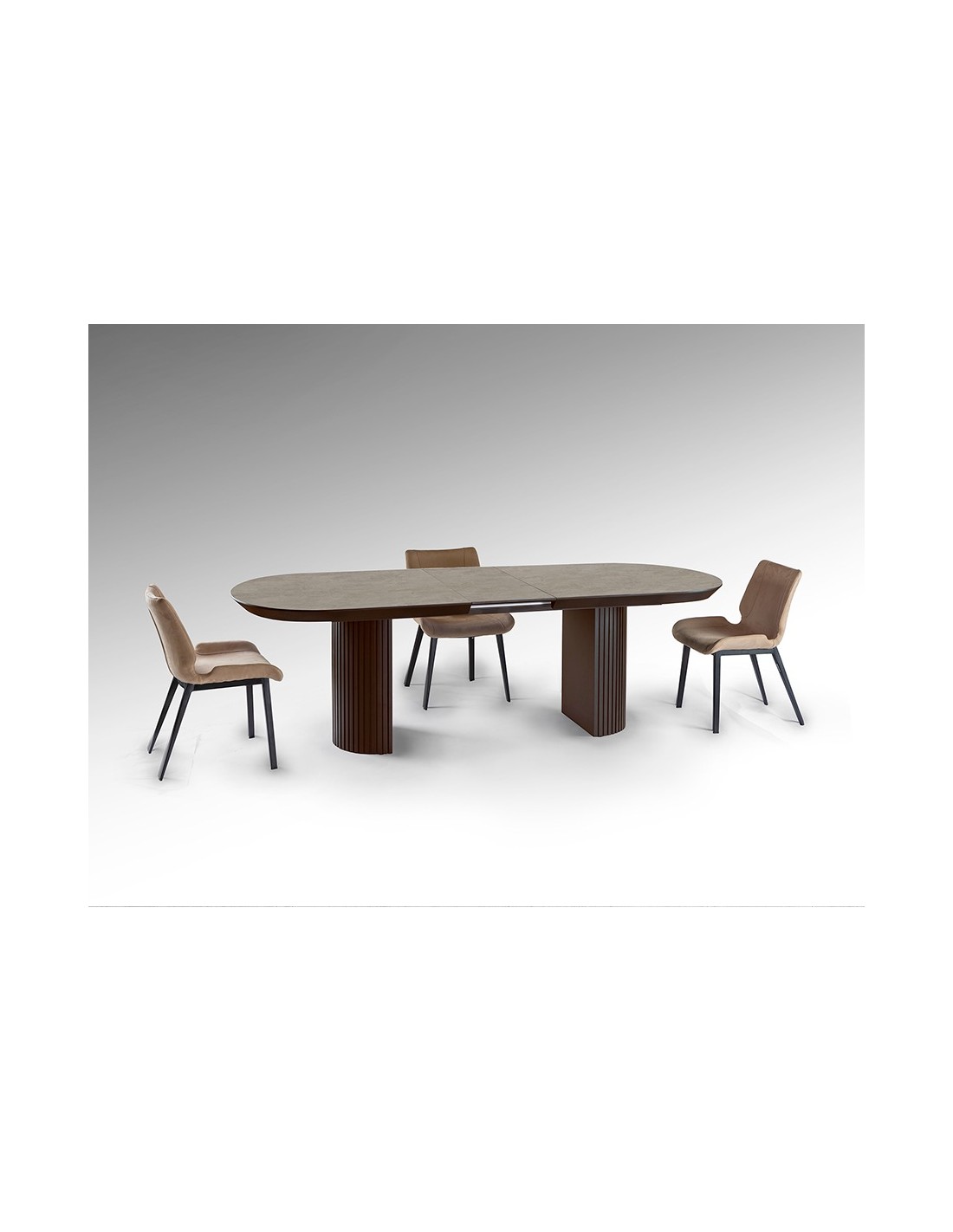 A mesa extensível IRATI foi desenhada para oferecer estilo, adaptabilidade e durabilidade no centro da sua sala de jantar. Com uma base em MDF com acabamento marrom ferrugem e tampo melamínico efeito pedra mate, esta mesa destaca-se pela sua estética moderna e pela capacidade de crescer quando precisa de mais lugares à mesa.