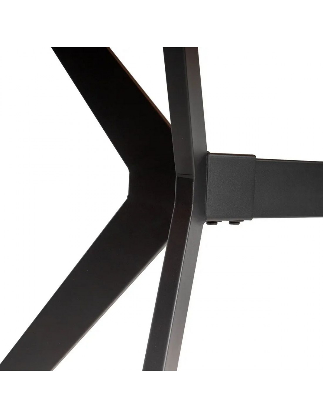 O tampo de 40 mm oferece firmeza e um aspeto visual sólido. O acabamento em imitação madeira proporciona um toque acolhedor, enquanto o contraste com as pernas metálicas pretas realça uma estética forte e contemporânea. A distância entre pernas laterais (58 cm) e frontais (146 cm) garante conforto ao sentar-se, sem interferências estruturais.