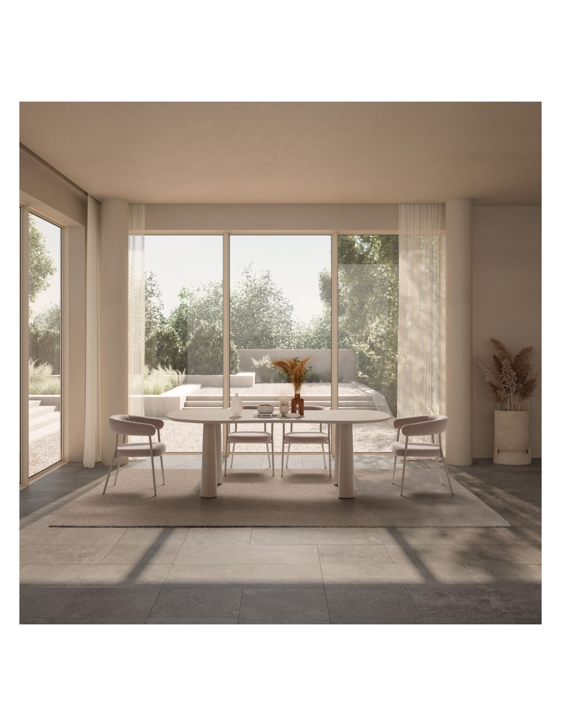 Numa sala de jantar com cerca de 30 m², a Mesa NAHIA permite acomodar 8 cadeiras confortavelmente, mantendo espaço suficiente para um aparador ou vitrina. O seu tom areia cria continuidade visual com paredes claras e pavimentos em madeira natural.