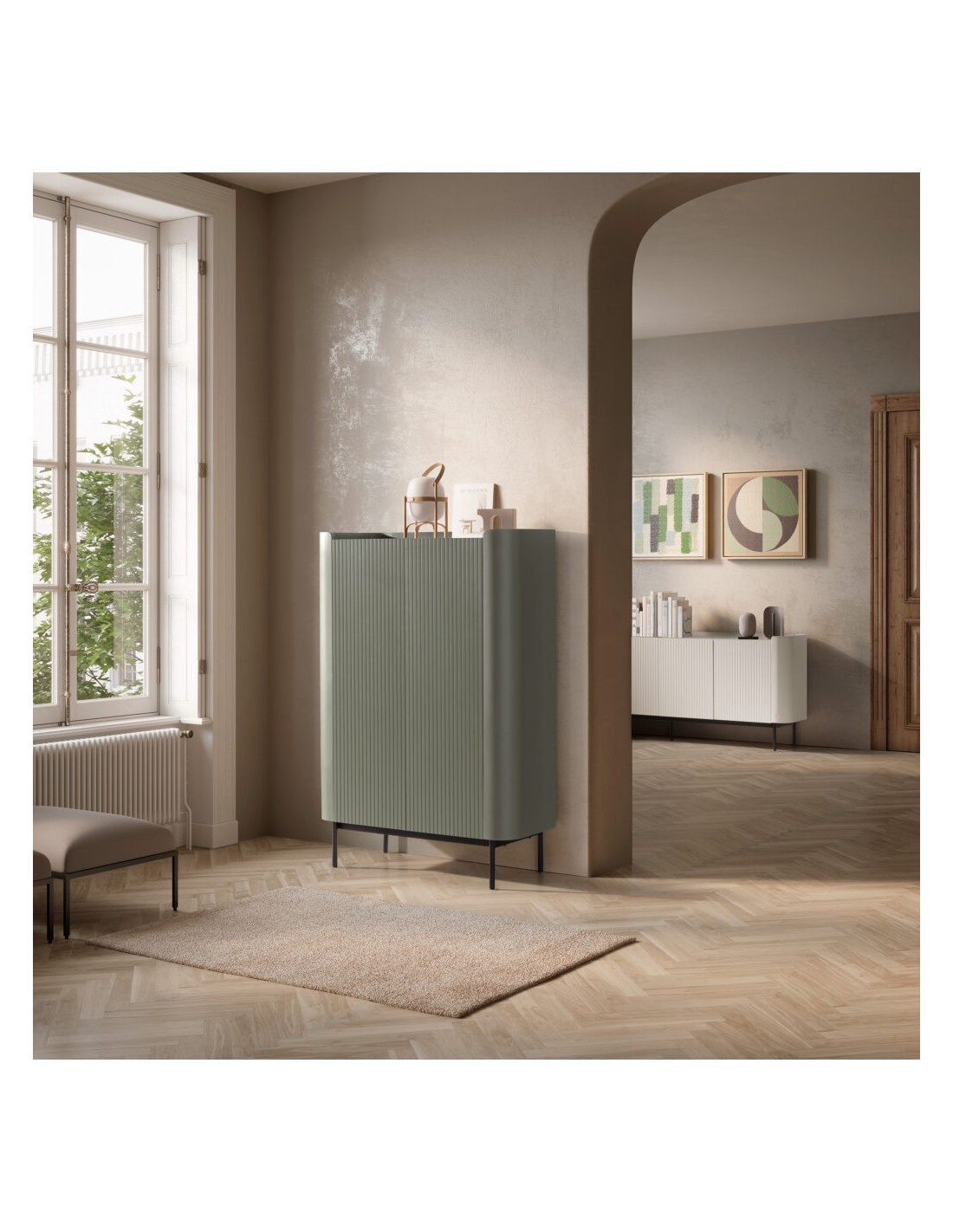 O acabamento creme acrescenta personalidade e elegância ao espaço, transformando o aparador numa peça central que chama todas as atenções.
