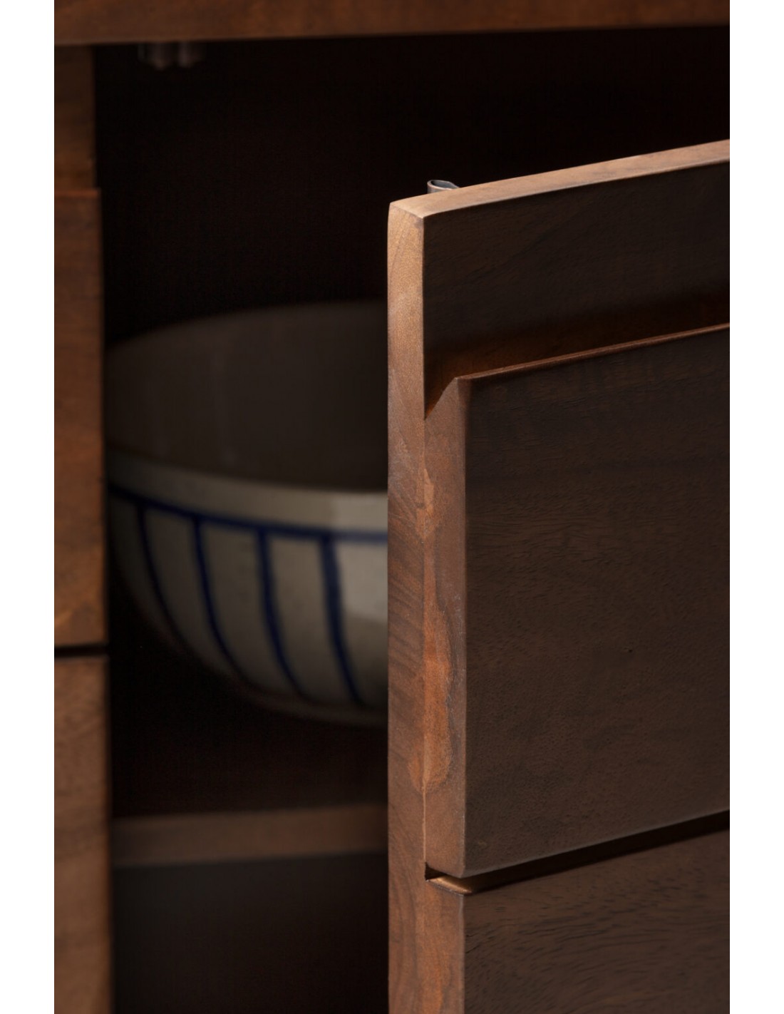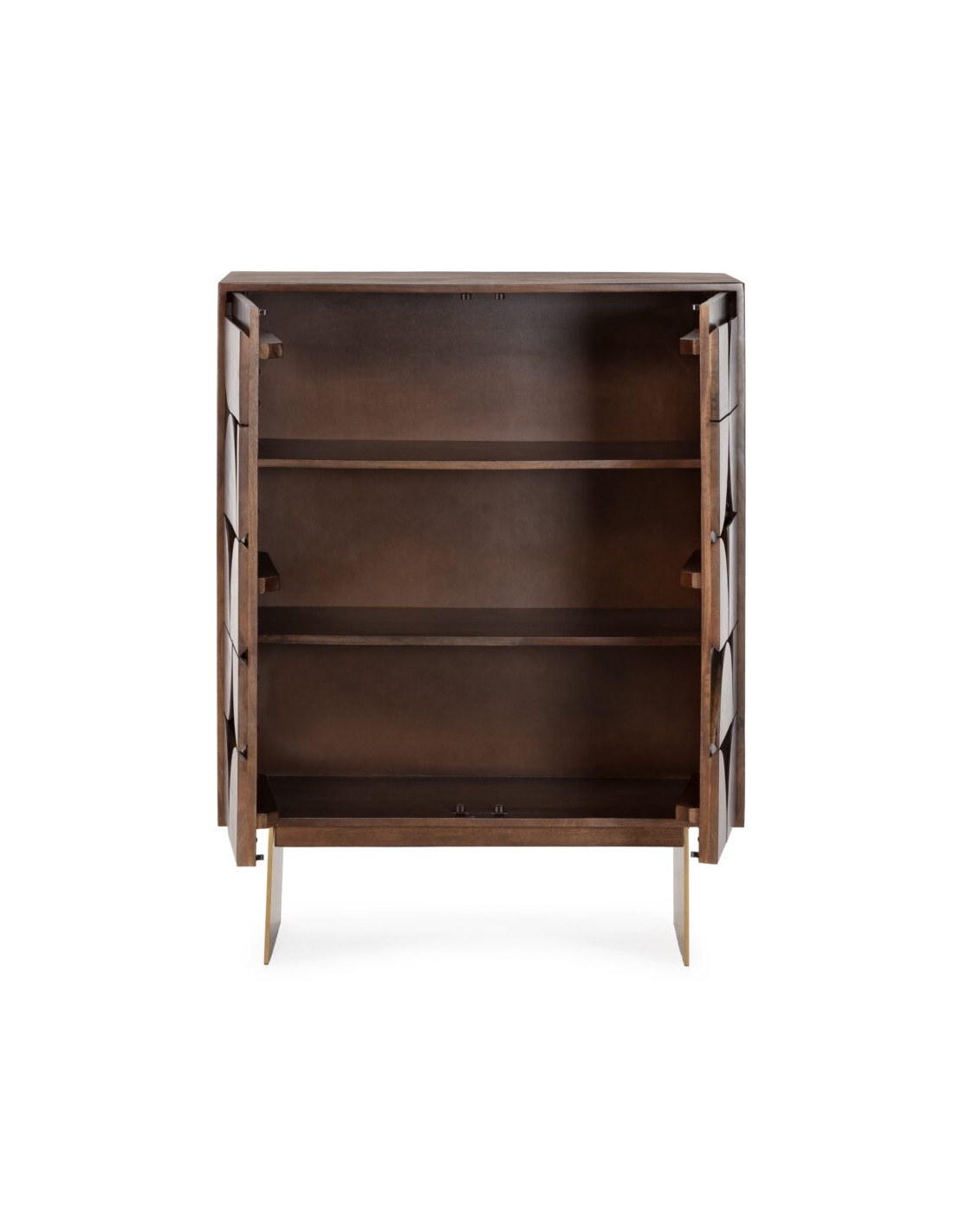 O aparador TRISHA destaca-se pelo seu frontal talhado com formas geométricas, uma tendência muito presente no design de interiores atual. Este tipo de acabamento recorda a tradição artesanal da escultura em madeira, reinterpretada com um estilo contemporâneo.