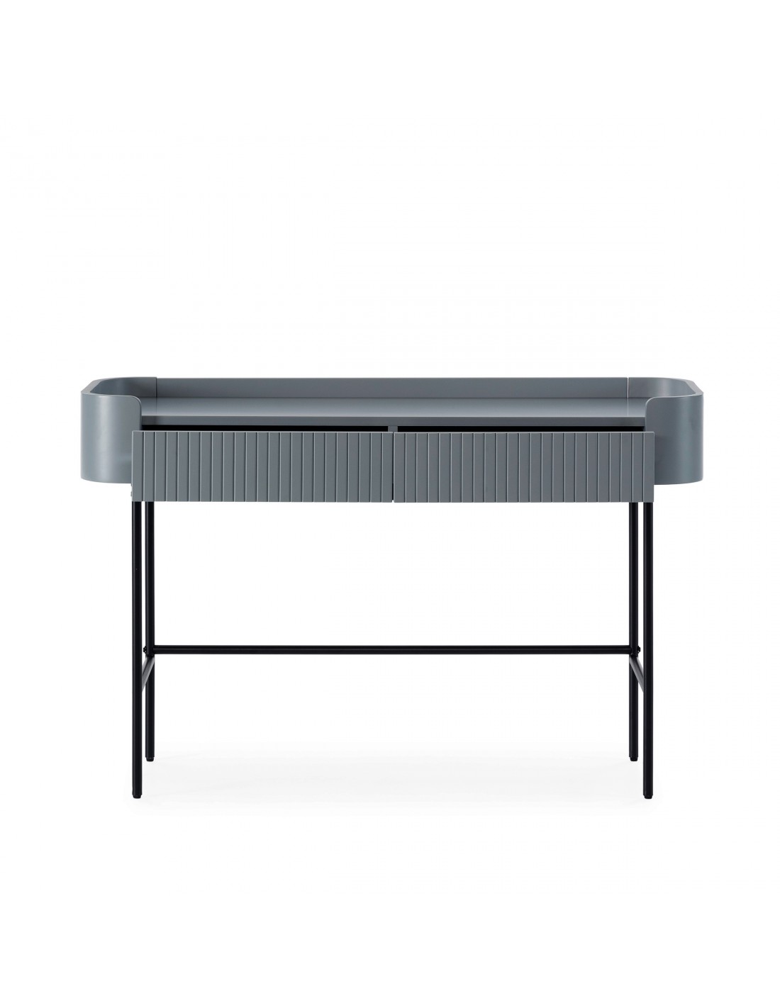 O azul profundo é uma tendência forte no design de interiores europeu, substituindo tons neutros tradicionais e acrescentando personalidade aos ambientes. A estrutura metálica preta cria contraste e leveza visual, resultando numa consola equilibrada e sofisticada.