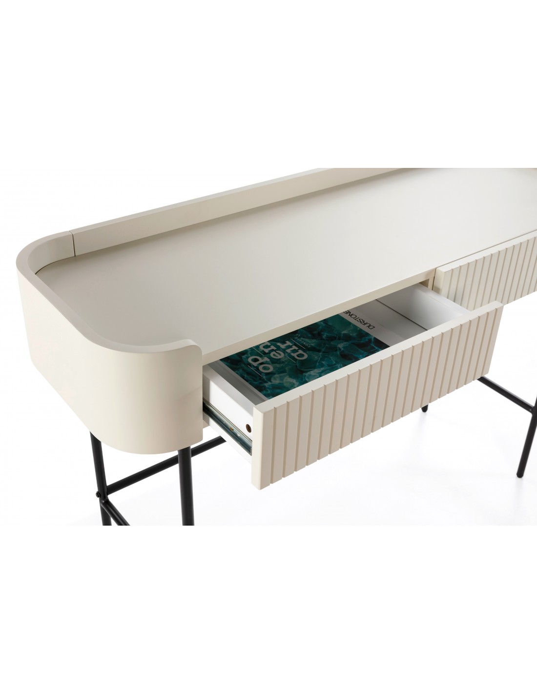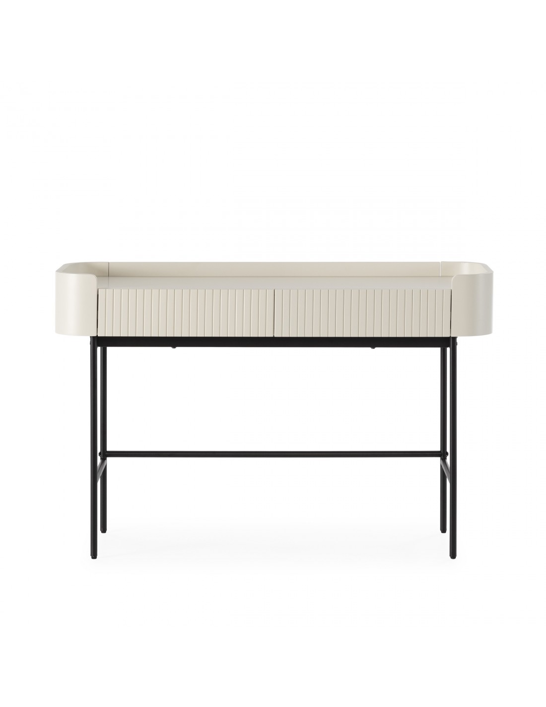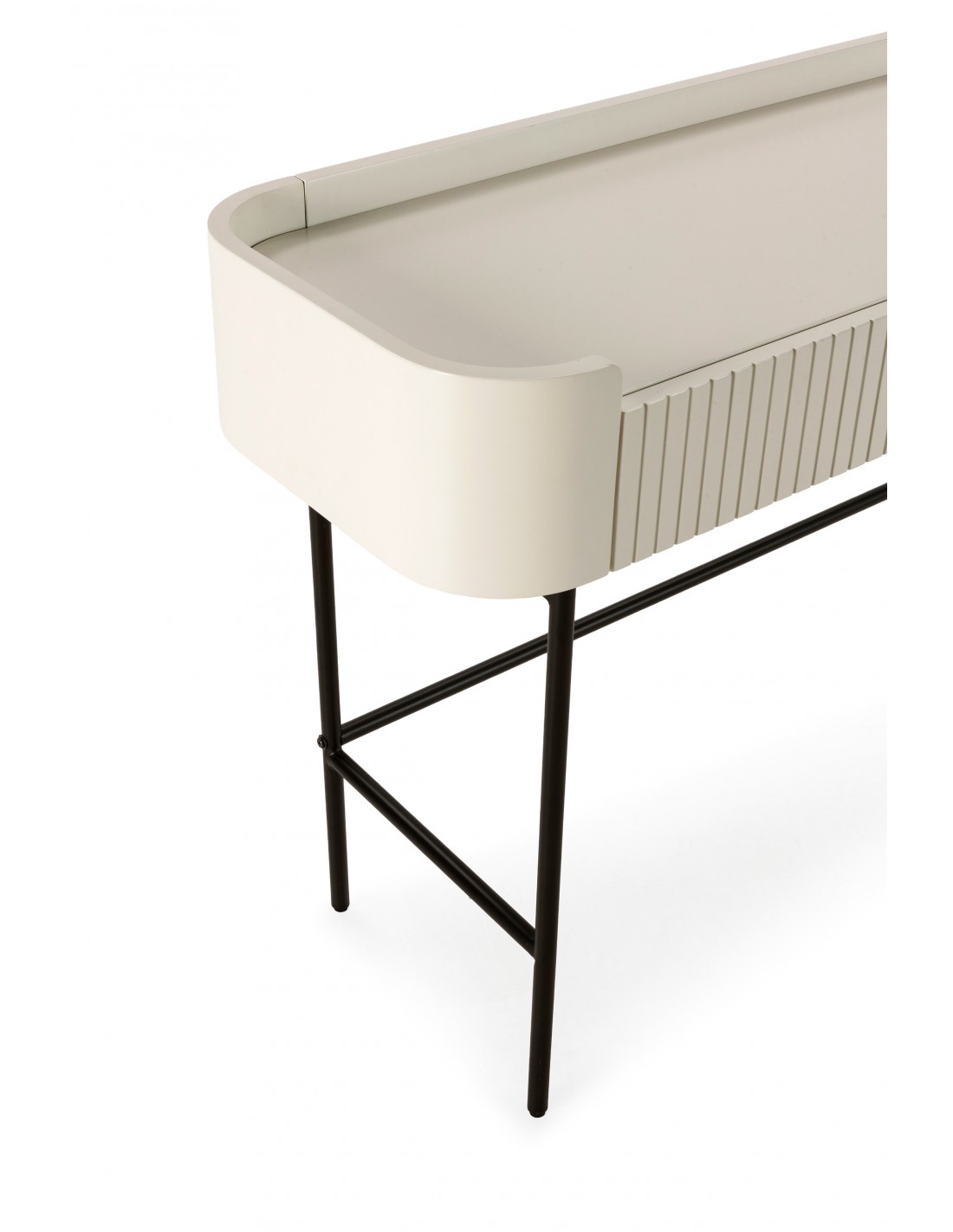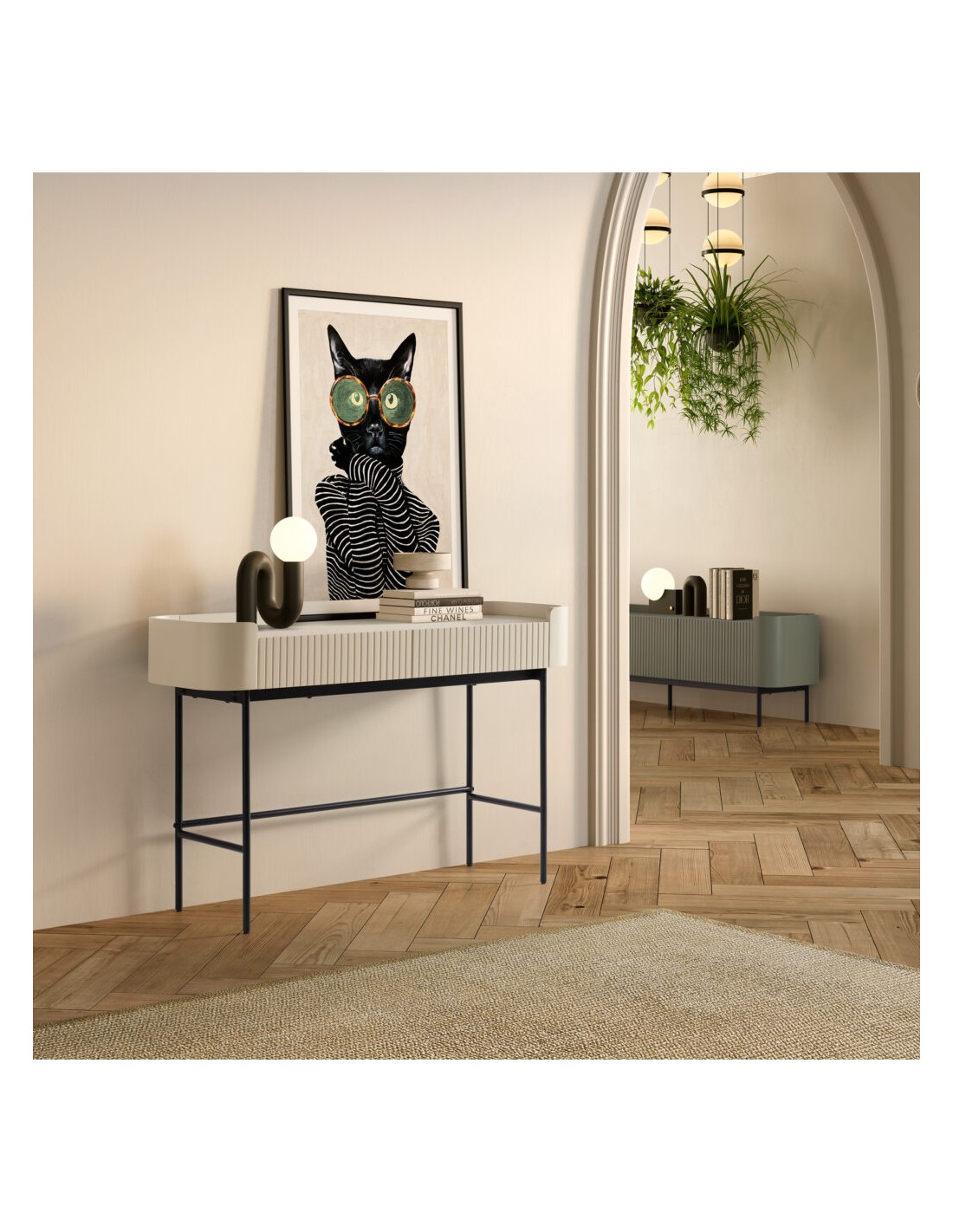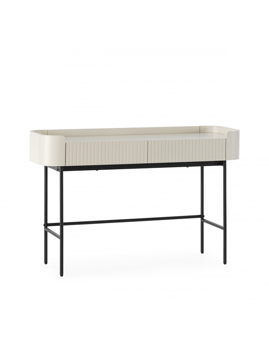 O creme profundo é uma tendência forte no design de interiores europeu, substituindo tons neutros tradicionais e acrescentando personalidade aos ambientes. A estrutura metálica preta cria contraste e leveza visual, resultando numa consola equilibrada e sofisticada.