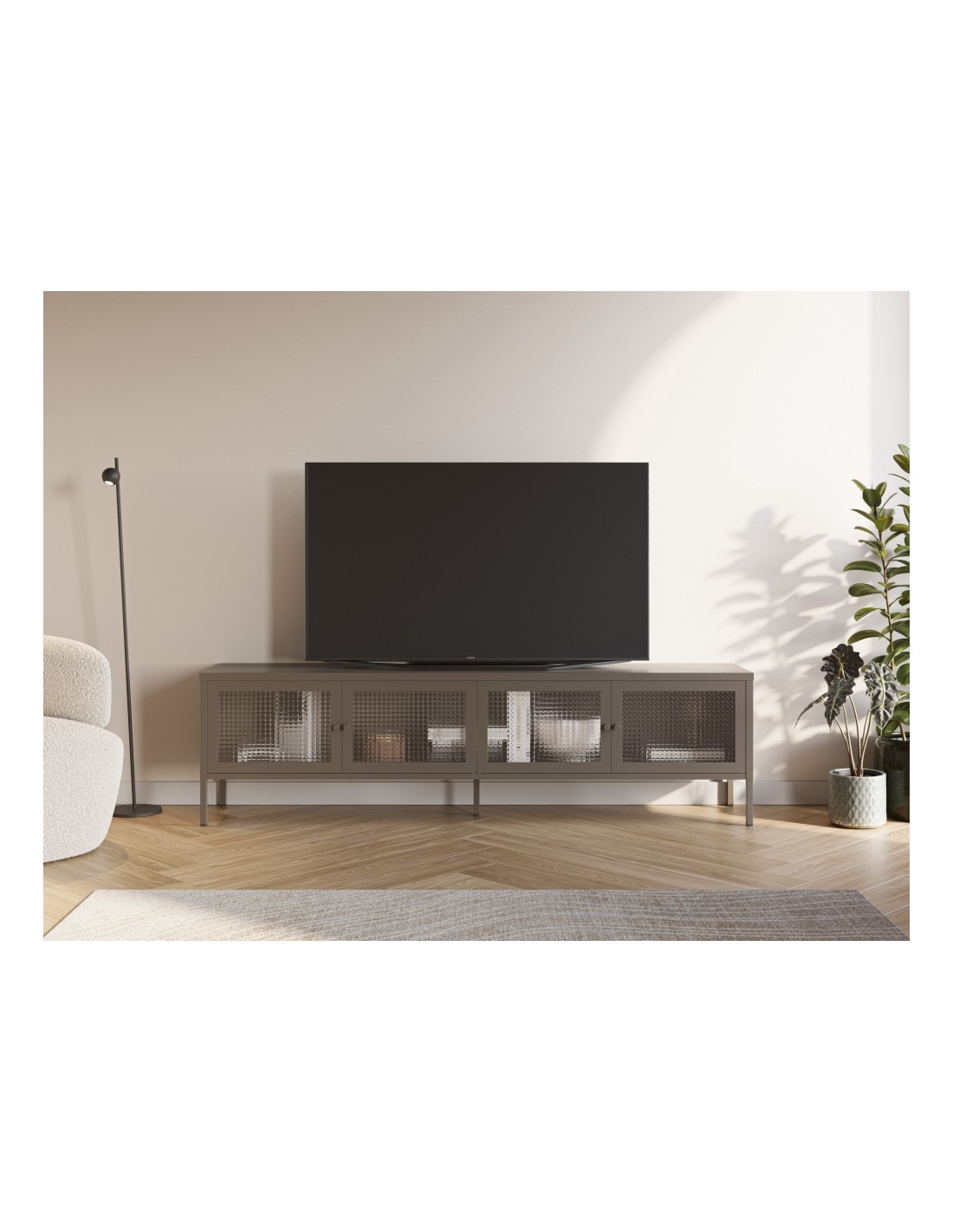 O móvel de TV metálico minimalista LAYNA moka 160 cm com 4 portas de vidro é a escolha perfeita para quem procura qualidade, estilo e funcionalidade. Com entrega gratuita, design exclusivo e apoio personalizado, a CentrolandiaShop oferece uma experiência de compra segura e elegante. Transforme a sua sala com um móvel que alia organização e sofisticação.