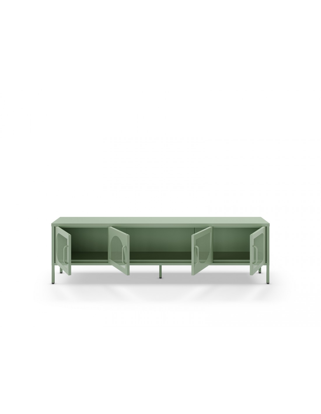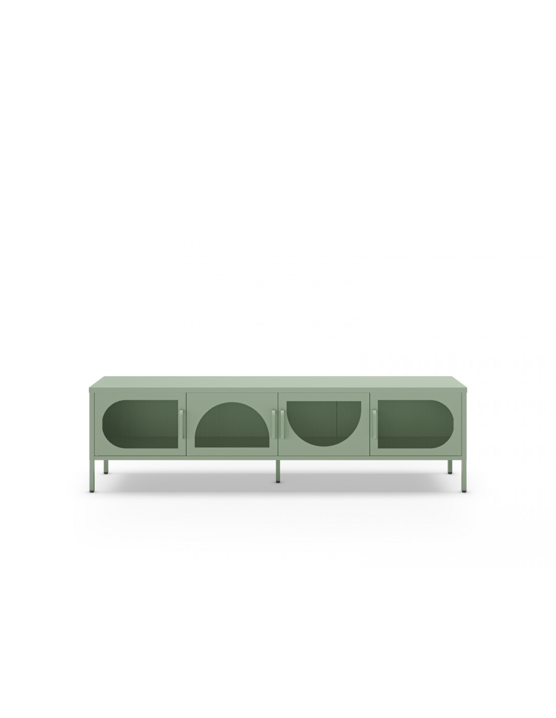 O Móvel de TV metálico minimalista TAYRA 180 cm com 4 portas destaca-se pelo seu design contemporâneo e estrutura em metal lacado de alta qualidade. Inspirado na estética industrial moderna, combina funcionalidade e estilo para criar um ambiente harmonioso e sofisticado. O seu comprimento de 180 cm é perfeito para televisores de grandes dimensões, enquanto as quatro portas com grelha metálica proporcionam ventilação interna ideal para consolas, routers e outros dispositivos eletrónicos.