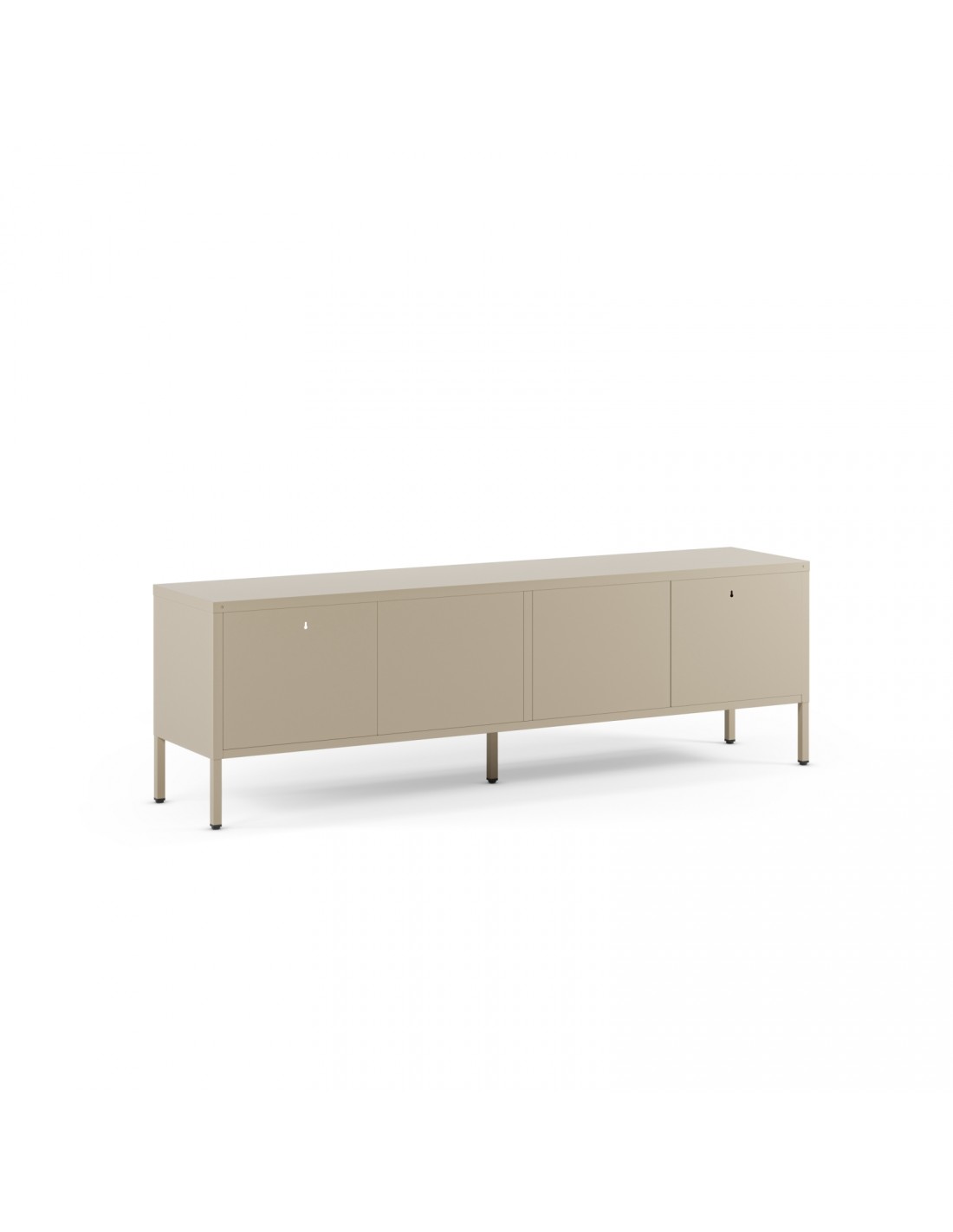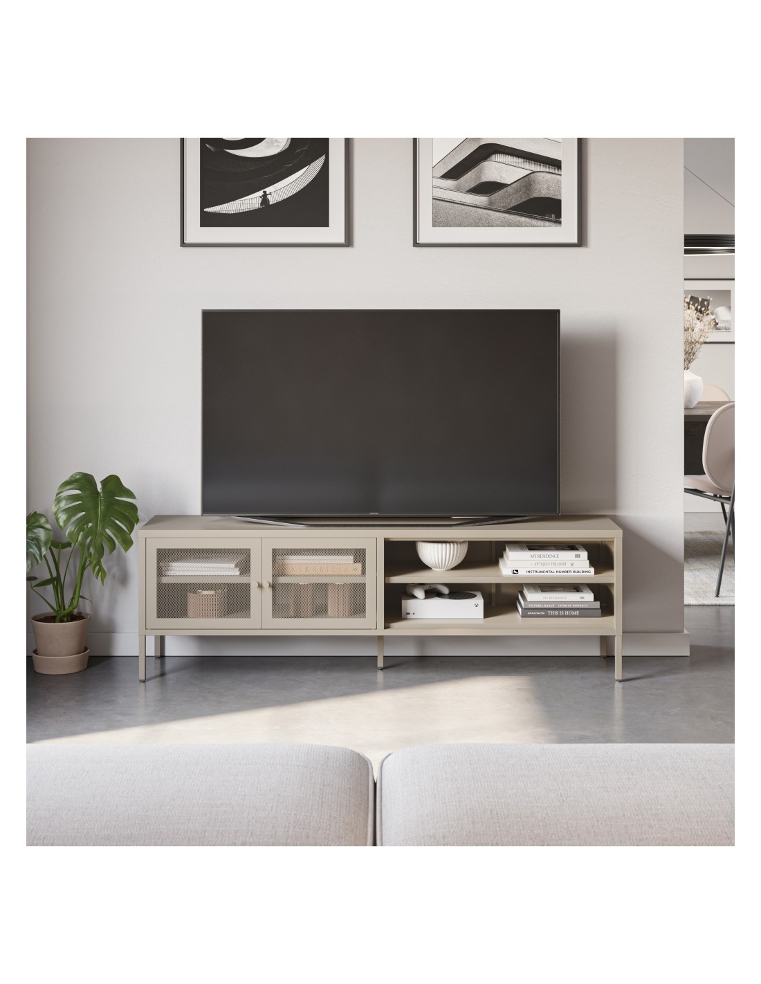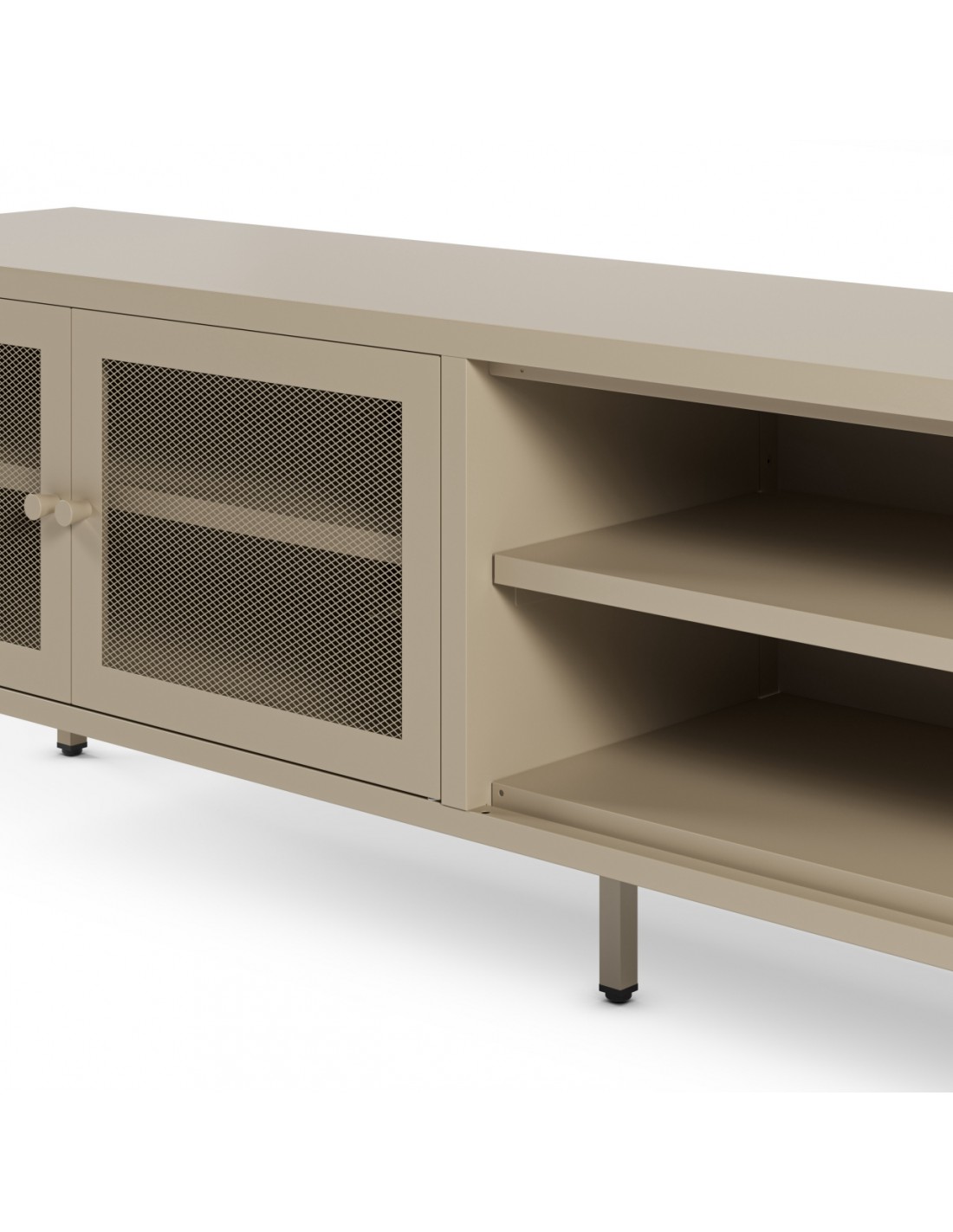 Móvel de TV minimalista FAYNA em metal na cor areia, 160 cm com 2 portas e 2 prateleiras abertas.