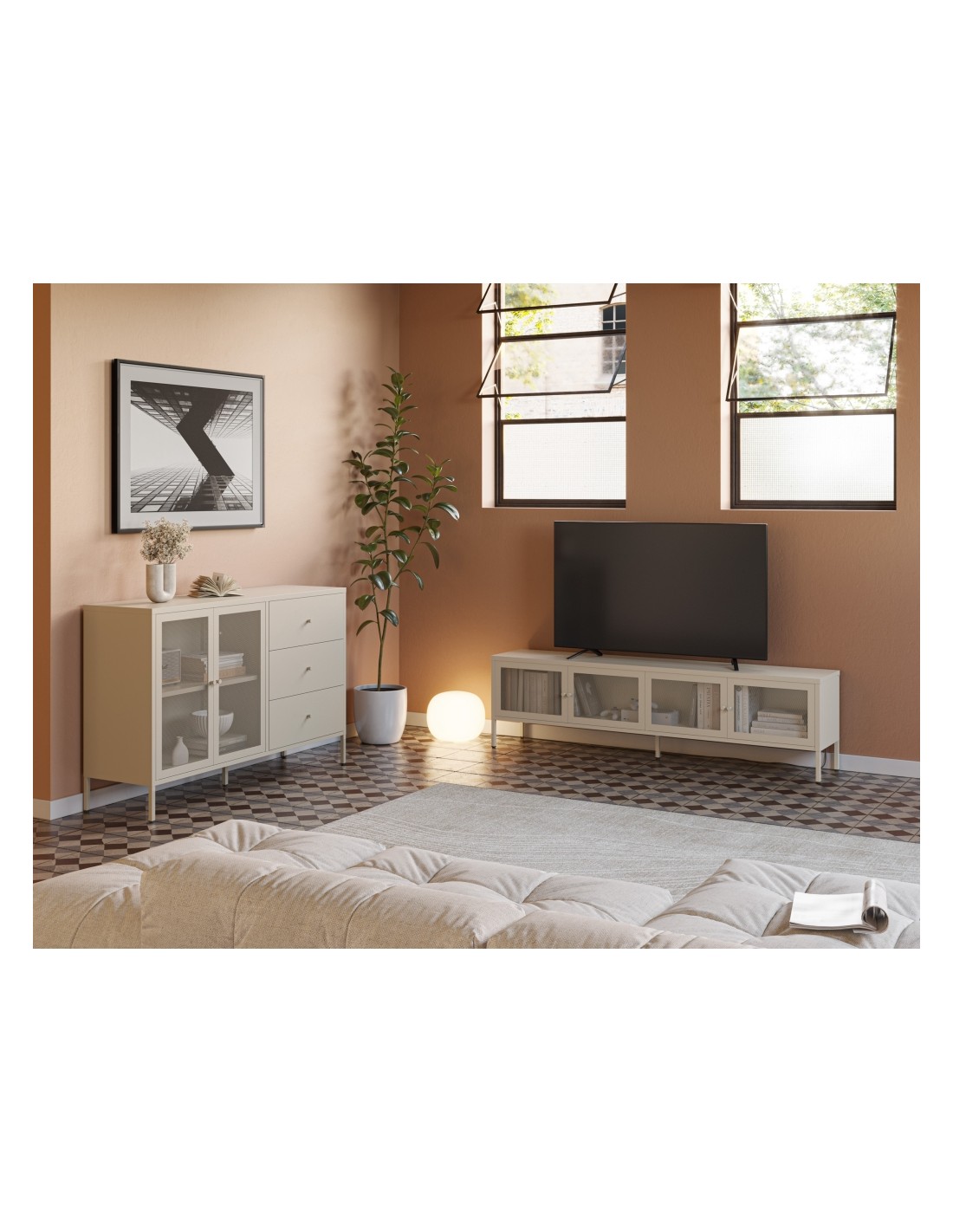 Imagina uma sala moderna, organizada e com decoração neutra. O FAYNA destaca-se pela sua presença elegante e discreta, mantendo todos os dispositivos ocultos atrás das portas com grelha metálica. A estética industrial reinterpretada remete ao estilo europeu do século XX, adaptado às exigências dos lares contemporâneos.