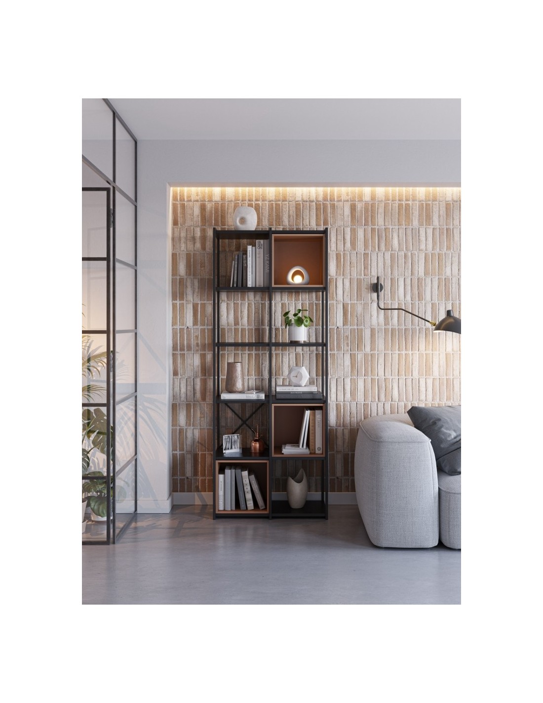 Prateleira design ANYA 70 x 179, melamina preta, cubo em terracota, base em metal