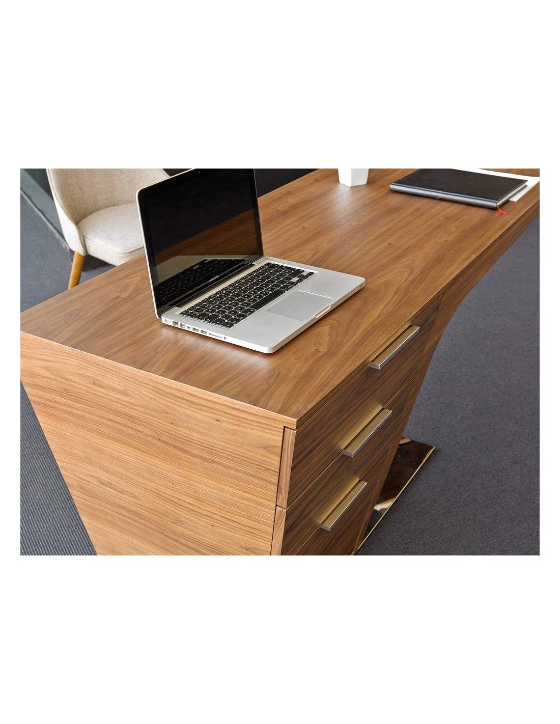 Mesa de escritório de estilo moderno de madeira folheada em nogueira natural de 0,0,5 cm de espessura e gavetas laterais, duas simples e uma dupla, com sistema de fecho soft-closing, perfeitos para que mantenha em ordem o seu espaço de trabalho. Os seus puxadores de aço inoxidável e a sua base em aço inoxidável cromado de 22 mícrons fazem desta secretária um design uma peça perfeita para trazer um look sofisticado e elegante à sua área de trabalho.