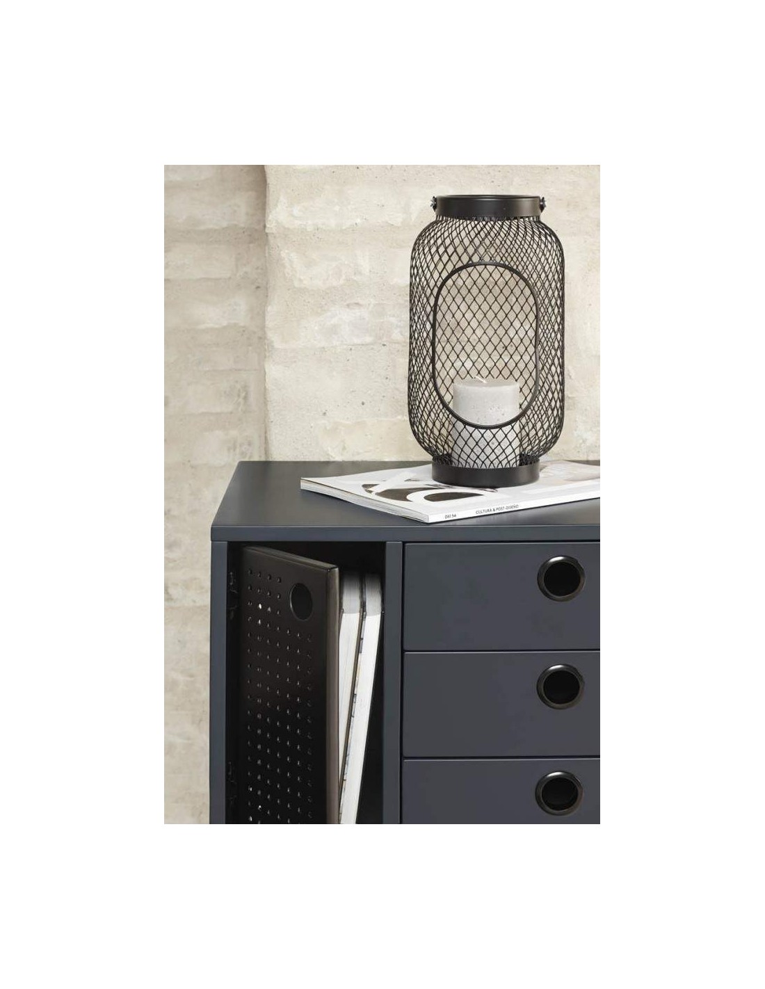 Mesa de inspiração industrial. Formada por porta metálica preta perfurada com puxador circular integrado. O capacete é feito em DM lacado em azul acinzentado. As gavetas possuem trilhos com auto fechamento, o que garante um fechamento automático suave e silencioso. Incorpora uma perna de apoio regulável para um ajuste à perfeição perante qualquer desnível do solo. Tem 3 gavetas e uma porta. No seu interior encontramos um espaço dividido por uma prateleira, aumentando as possibilidades de distribuição do móvel. Móveis de linhas limpas que resgatam a força do vanguardismo industrial para se adaptar aos espaços mais atuais.