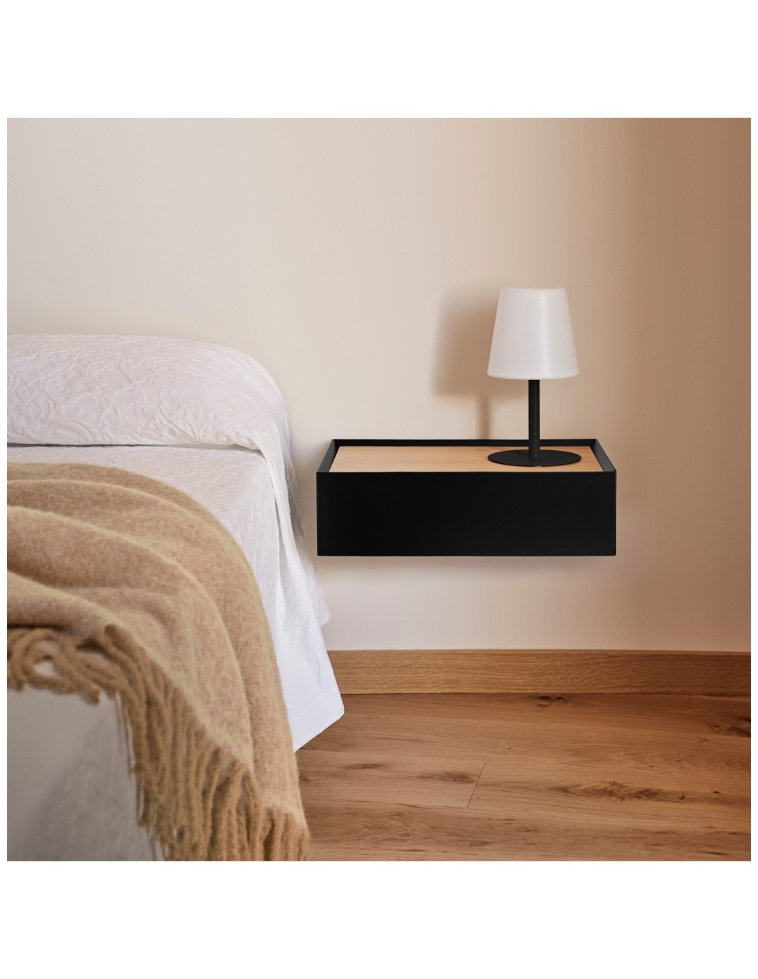 Mesa de cabeceira SUSPENSA minimalista TEULAT ARISTA 50 x 16, 1 gaveta, preto e carvalho