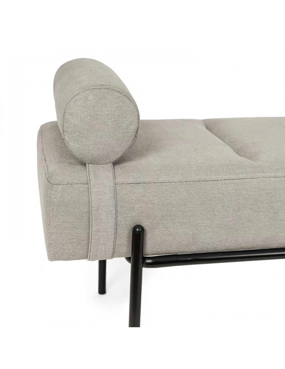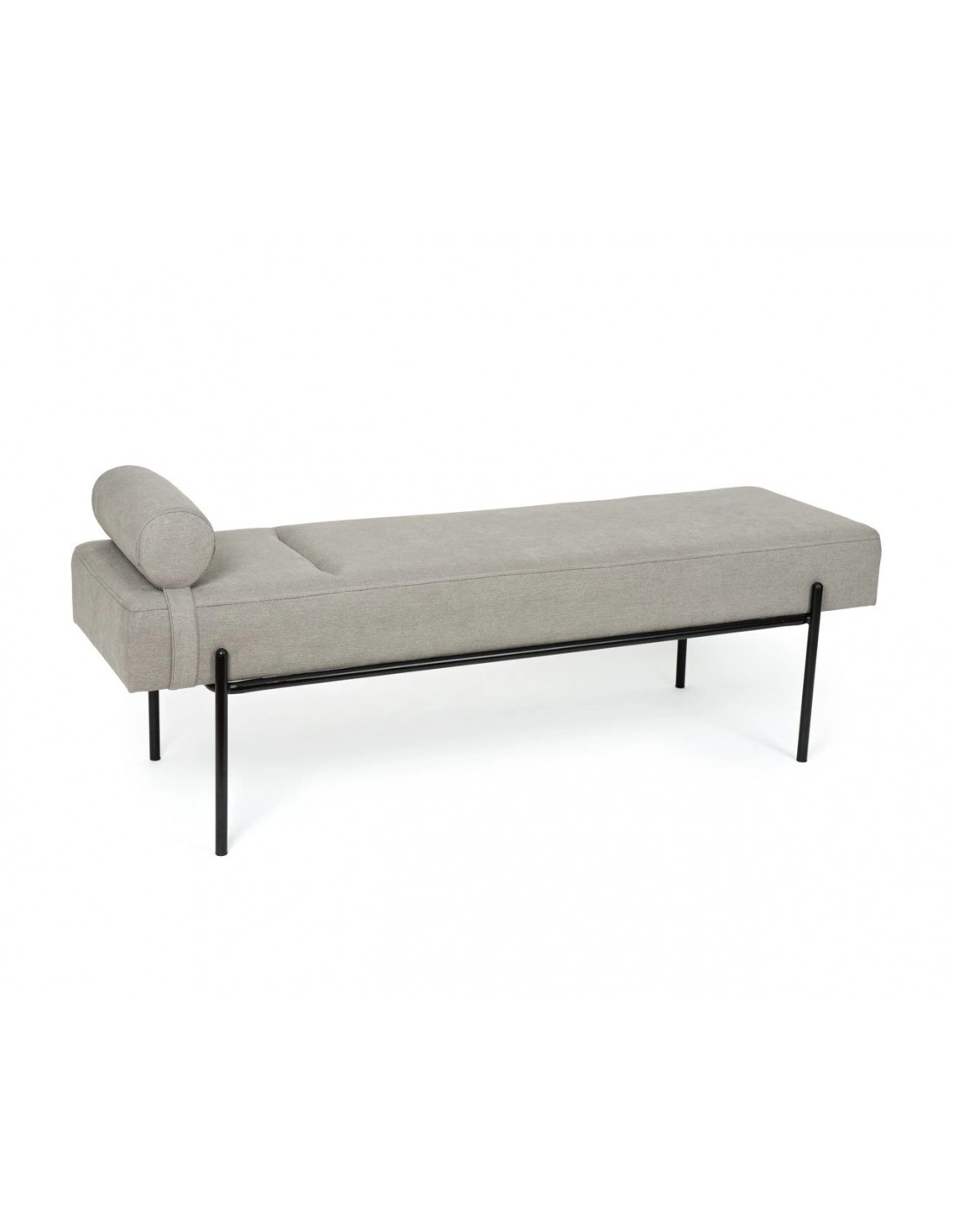 Banco de design clássico moderno, um complemento perfeito de conforto ideal ao pé da cama, num corredor, num escritório ou na sala de estar. Em compensado, estofamento em espuma cinza claro, apoio de cabeça cilíndrico removível em uma das laterais. Pernas resistentes em metal lacado preto, desfrute de um móvel original, multifuncional e confortável em casa.