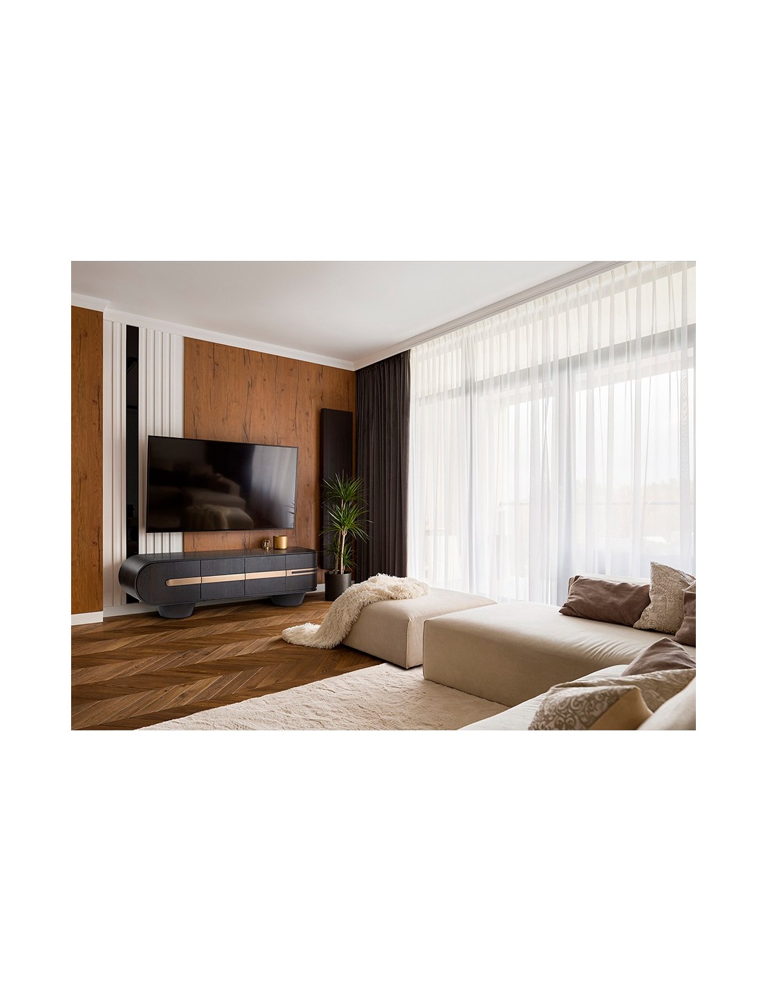 O móvel de TV LUCA com 4 portas é uma escolha inteligente para quem valoriza design contemporâneo, materiais premium e arrumação eficiente. Combinando carvalho escuro com toques dourados, transforma qualquer sala num espaço requintado.