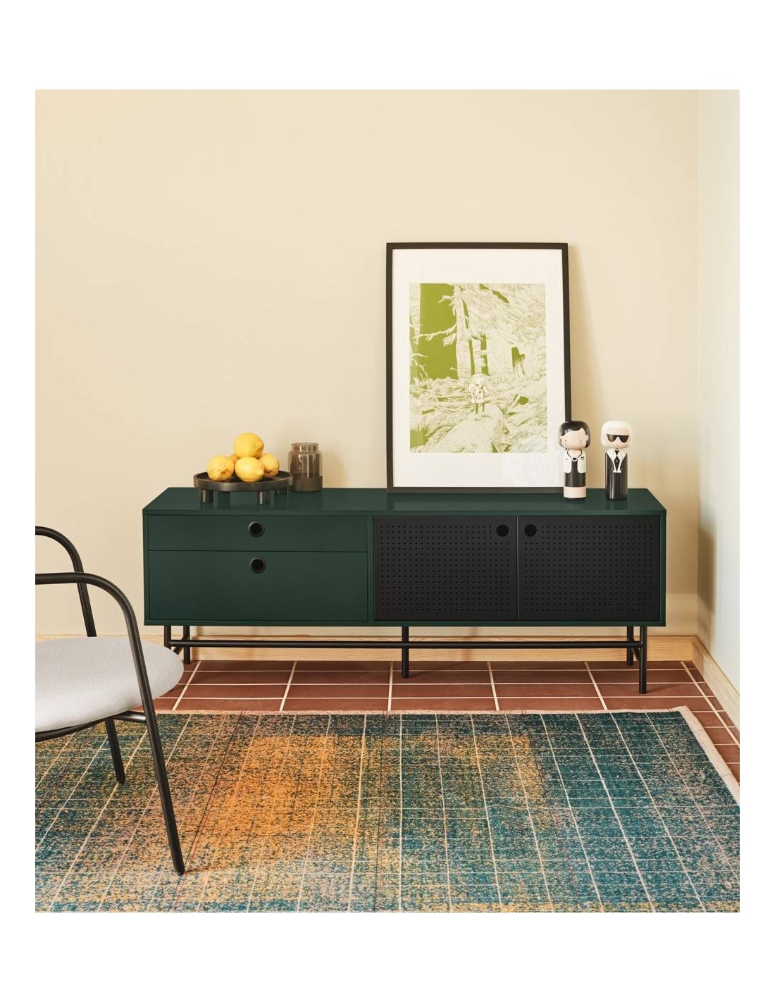 O móvel TV Punto apresenta 2 portas metálicas perfuradas com puxador circular integrado, sinal distintivo da coleção. No seu interior dispõe de duas prateleiras para armazenamento. Além disso, encontramos uma saída para cabos na parte de trás para mantê-los recolhidos e escondidos O capacete é feito em DM lacado nas cores branco, verde escuro e azul...