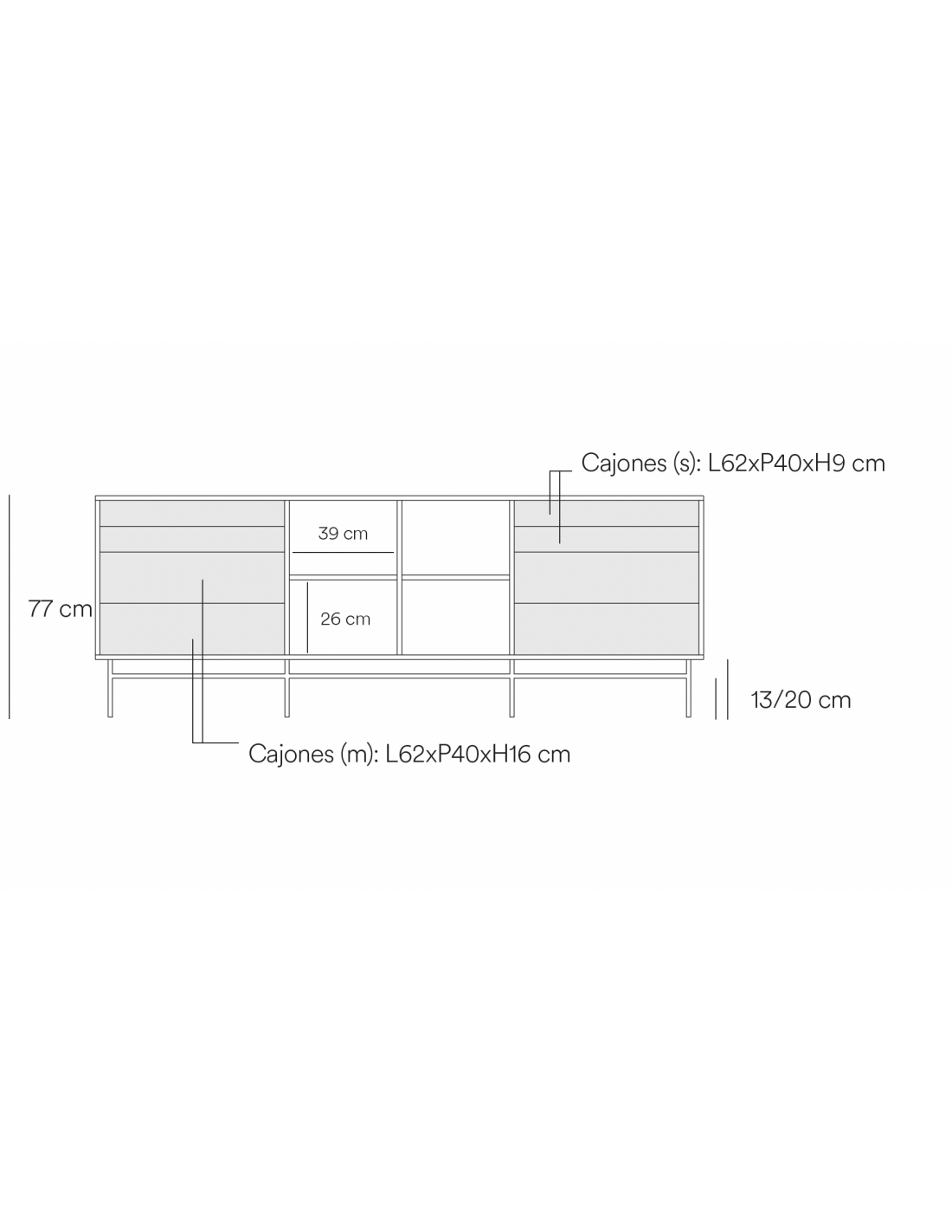 O aparador ponto é composto por duas portas e oito gavetas. No interior encontramos duas prateleiras, complementando assim o amplo espaço de armazenamento do móvel.