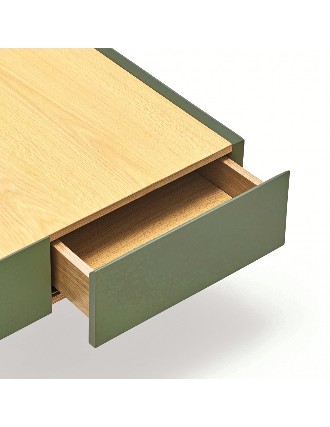 Minimalista mesa de café design moderno. Projetado por Cambres Design para a marca TEULAT. O tampo do móvel é revestido em carvalho natural, enquanto o casco é DM lacado em branco, preto, bordô ou verde. Uma das características desta mesa é que cada uma das gavetas tem um tamanho diferente, dando-lhe um caráter único. Composta por duas gavetas nos lados opostos, proporcionando um espaço extra de armazenamento. As gavetas vêm com dobradiças de amortecimento, o que garante um fechamento suave e silencioso. Um móvel auxiliar que trará um toque caloroso e acolhedor à sua casa.